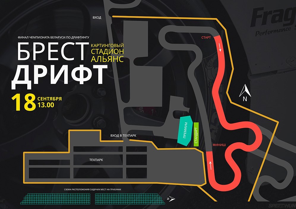 Вход будет открыт в 12:00, начало финальных заездов топ-16 Double Elimination — 14:00. Адрес стадиона «Альянс»: г. Брест, ул. Октябрьской революции, 117Б, координаты для навигатора: 52.078928, 23.814931.