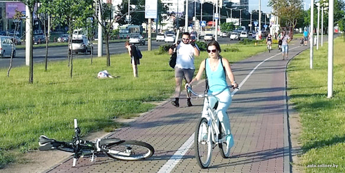 Ехал по велодорожке, был уверен в своем приоритете. На подъезде к церкви на ул. Притыцкого (около ТЦ „Скала“) предусмотрен метр по ширине для велосипедистов, метр — для пешеходов. Там, за 30—35 метров, я заметил идущую впереди молодую пару, других пешеходов не видел. Девушка шла по пешеходной половине, парень — посередине велополосы. Я помахал, потом свистнул, крикнул: „Эй“. Потом посмотрел на дорогу, был уверен, что последует реакция. Но человек не отошел. Начал тормозить, но по инерции (ехал с горки) сбил парня, зацепил его руку рулем, колесо стало перпендикулярно направлению движения, после чего я опрокинулся. Ударился о тротуарную плитку, почувствовал боль во всей левой части тела. Увидел: парень пошел дальше, не обернулся».