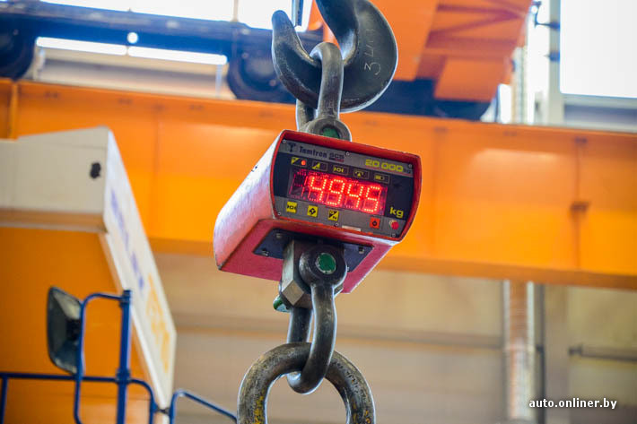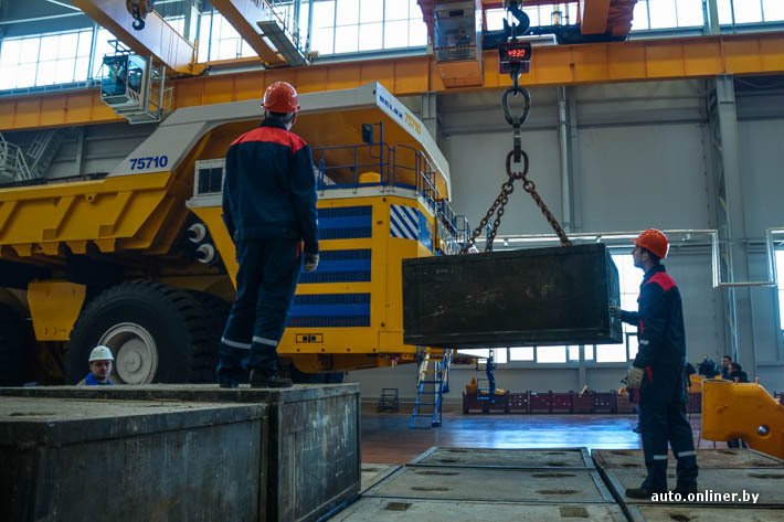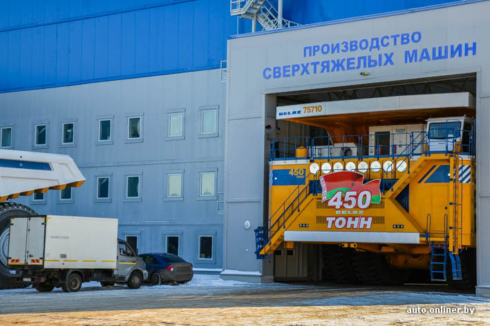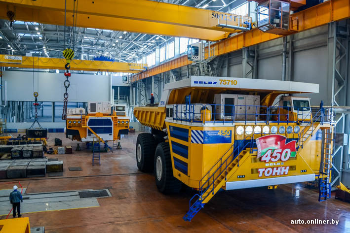 В пресс-службе БелАЗа на наш вопрос, можно ли так называть модель 75710, даже удивились: «Конечно! Это и есть самый большой самосвал в мире». Напомним, это первая модель в новом классе самосвалов особо большой грузоподъемности (официальная грузоподъемность машины — 450 тонн). При конструировании специалисты отошли от классической схемы. Наивысшей грузоподъемности, в частности, удалось добиться за счет применения восьми шин (у модели полный привод). Высокая маневренность достигается благодаря двум поворотным осям и оригинальной кинематике поворота. Радиус поворота составляет 19,8 метра!