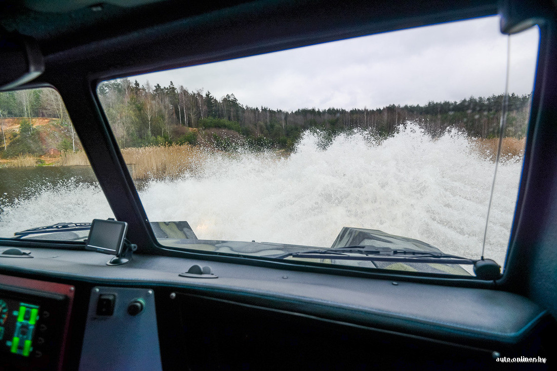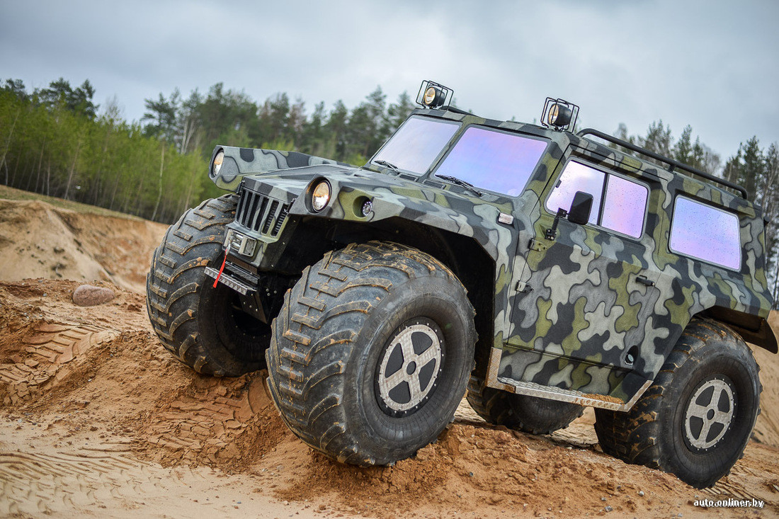 Брутальный снегоболотоход (или Overcomer), как официально называют автомобиль, собран на предприятии МАЗ-МАН. Он сразу привлек внимание, причем не только внешним видом — его проходимость впечатляет! Вездеход может передвигаться по любой поверхности: снежной целине, песку, болотам, тундре и водным преградам. Движение по воде осуществляется за счет вращения колес, опционально на снегоболотоход устанавливается гребной винт с приводом от мотора. С гребным винтом скорость движения по воде достигает 8 км/ч. Изменение направления движения осуществляется передними колесами.