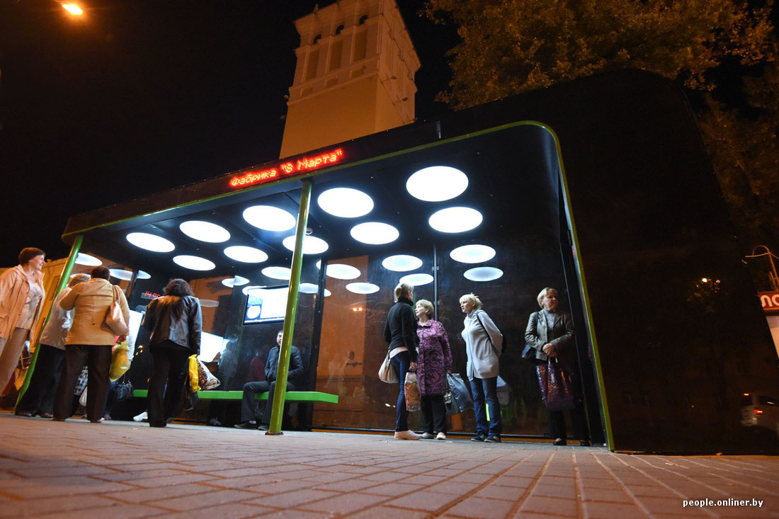 Некоторые переживают, что «арт-объект» проживет недолго, засекают время прибытия вандалов. Знатоки ночной жизни Гомеля скептически оглядывают темные углы остановки — найдутся, мол, желающие сделать там свои темные дела. Пожилая женщина с тележкой волнуется, пробует ногтем темный поликарбонат: «Есть же дураки, которые испортят...» Когда указывают на камеру под потолком, немного успокаивается.