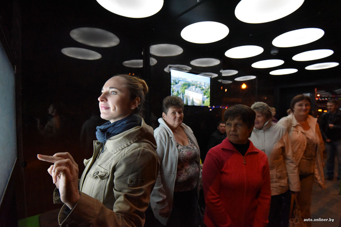 Один экран внутри остановки сенсорный, на него выведены карта и список маршрутов всех видов городского транспорта с сайта «Гомельоблпассажиртранса». Можно задать точку, узнать, на чем туда доехать. Также в реальном времени видно, через сколько минут на этой остановке появится троллейбус, автобус или маршрутка. (Вообще-то, то же самое можно увидеть и с телефона.) Это в теории: пока экран подтормаживает, к нему надо приноровиться. Представители «АйТиПроектСтроя» не унывают, рассказывают, что система будет совершенствоваться, а на экран можно вывести что угодно, хоть игрушку.