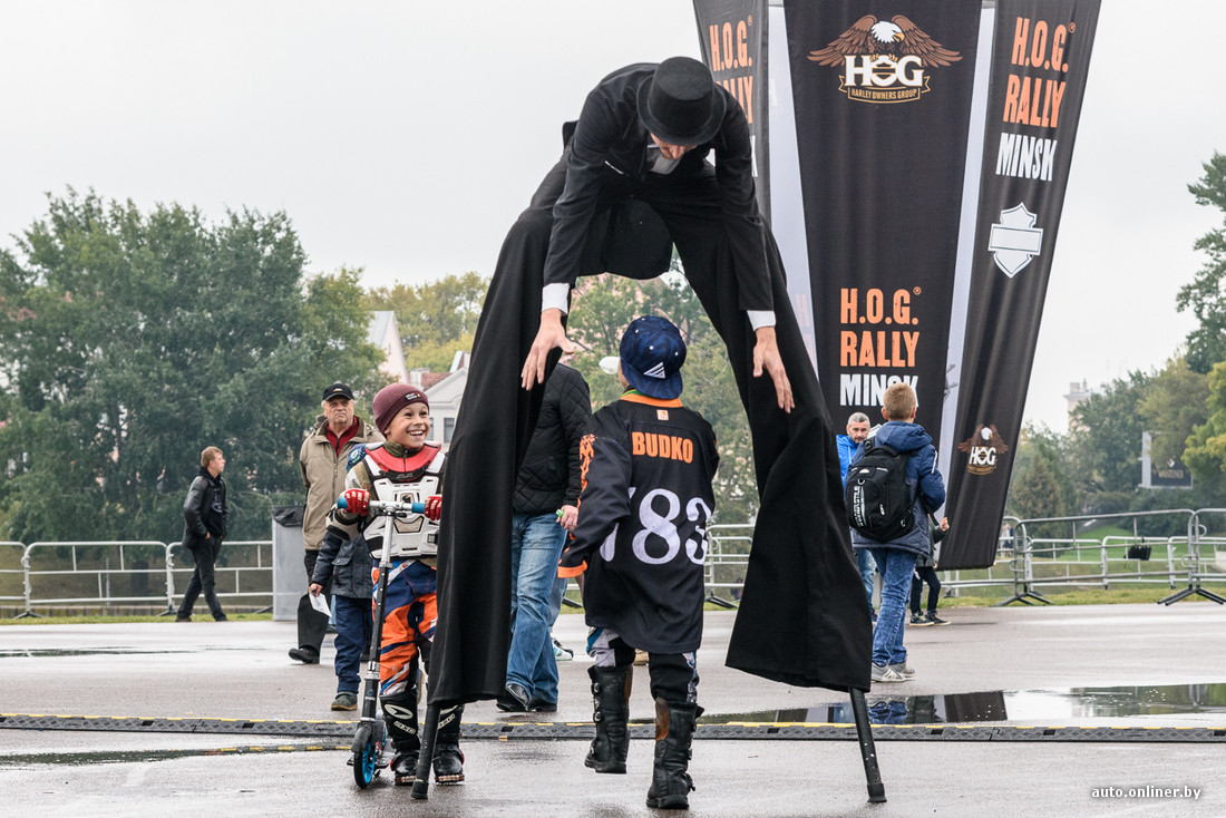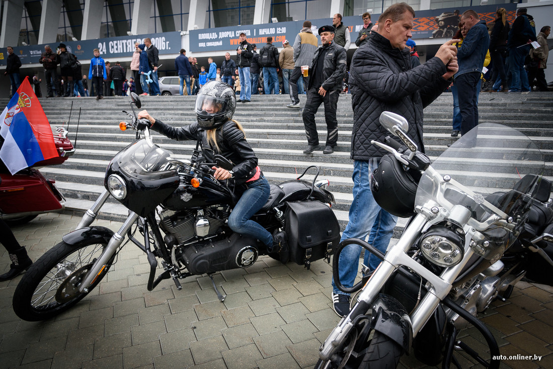 С самого утра подходы к центральной части пр. Победителей перекрыли. Попасть на тротуар можно было только пройдя досмотр (причина усиленных мер безопасности станет известна позже). Со сцены, установленной на площадке возле Дворца спорта, разогревали публику ведущие и музыканты. В воздухе парил вертолет с огромным флагом HOG.