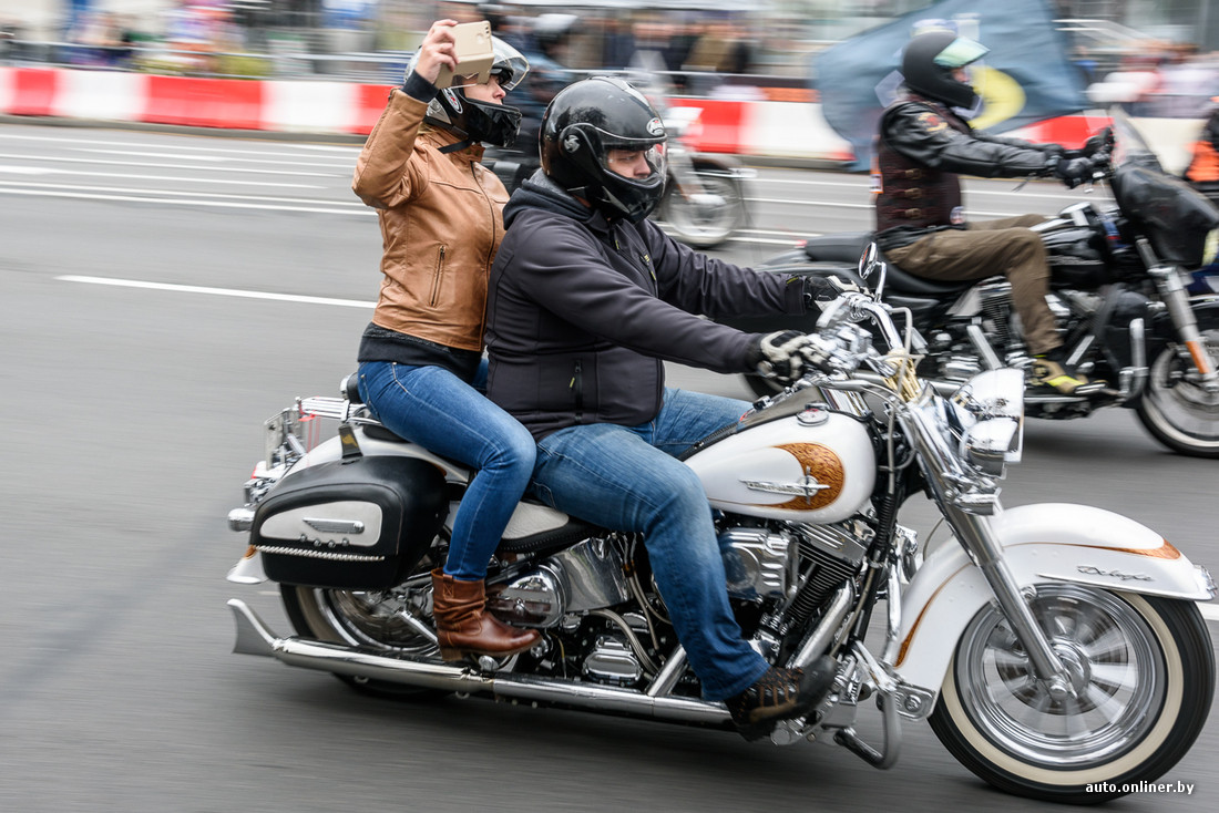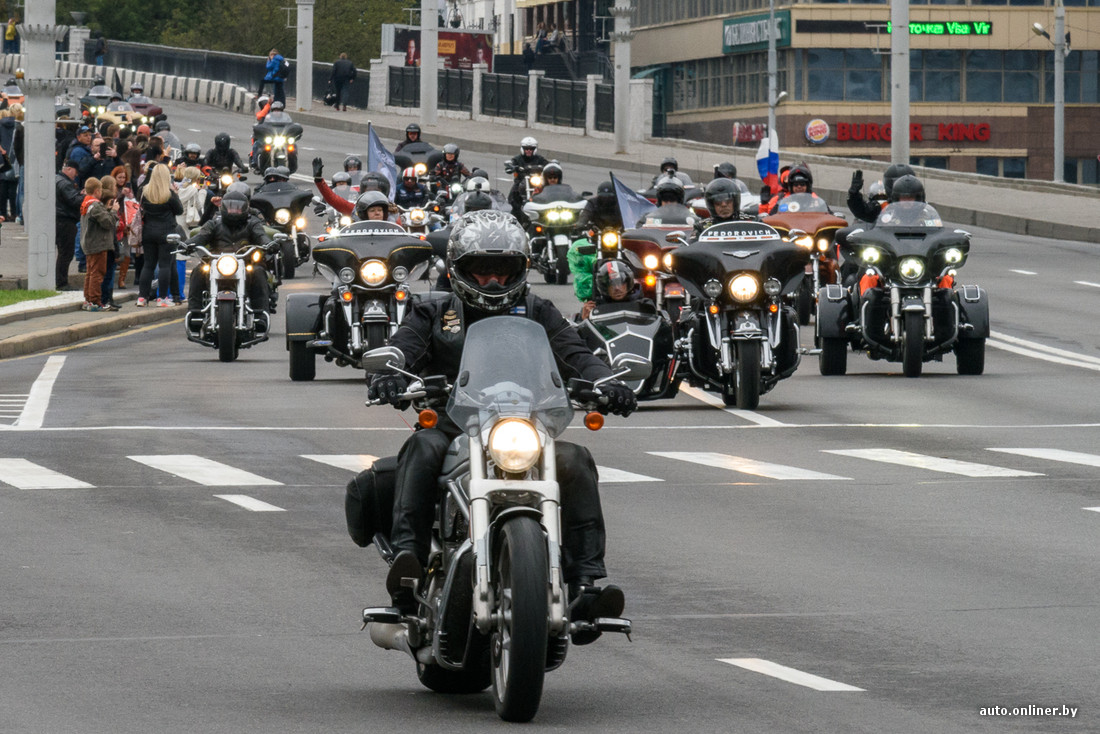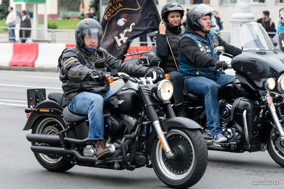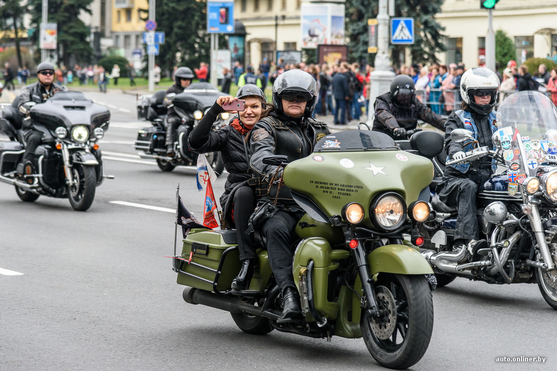 Следом проехали около трех тысяч мотоциклистов. В основном это были байки с белорусскими и российскими номерами. На некоторых мотоциклах развевались флаги Германии, США, Испании, Португалии и даже Новой Зеландии. Когда мы подошли к байкеру с немецким флагом, тот признался, что сам из Москвы, но «нужно было показать международное присутствие».