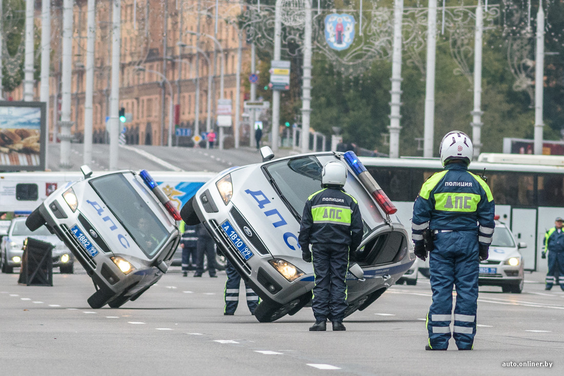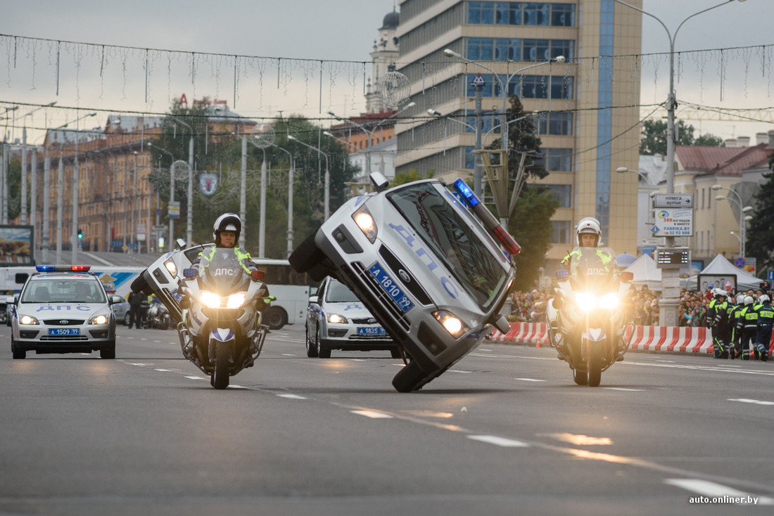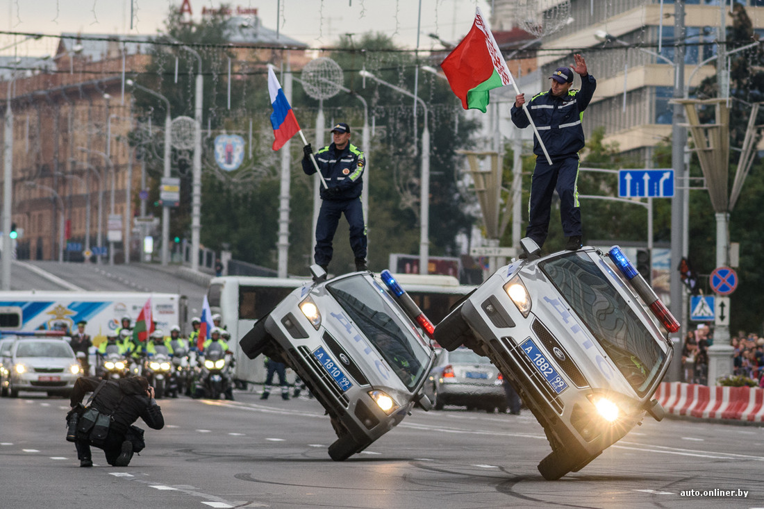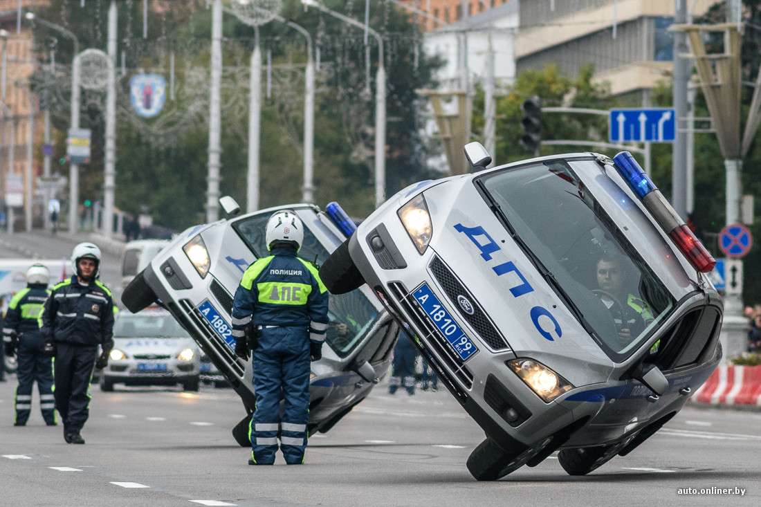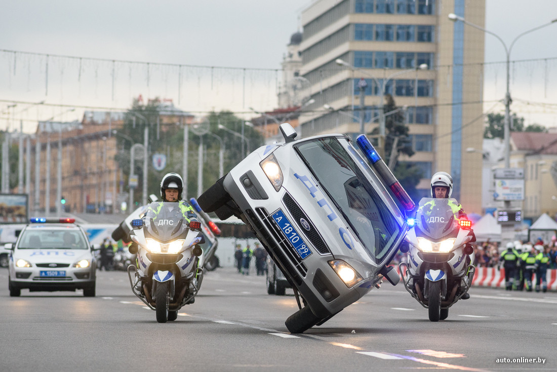 Затем пришел черед автомобилей. Выступали как сотрудники ГАИ Беларуси, так и ГИБДД России. Сначала слаженная четверка Ford двигалась в считаных сантиметрах друг от друга, да еще выполняла маневры. Потом их сменили белорусские инспекторы на Skoda.