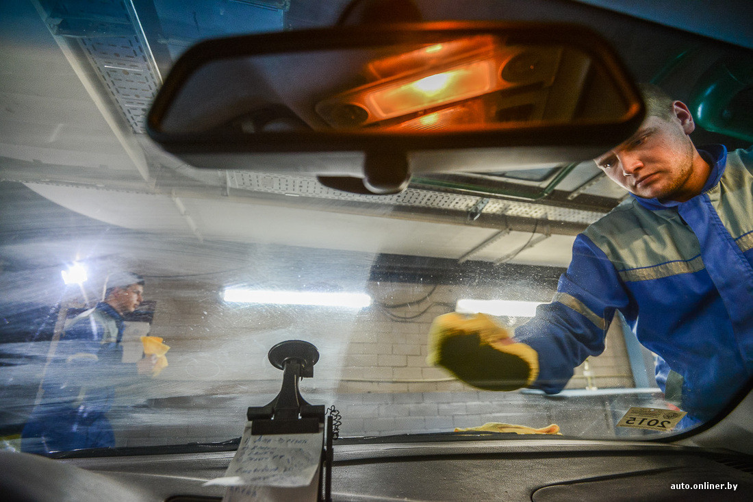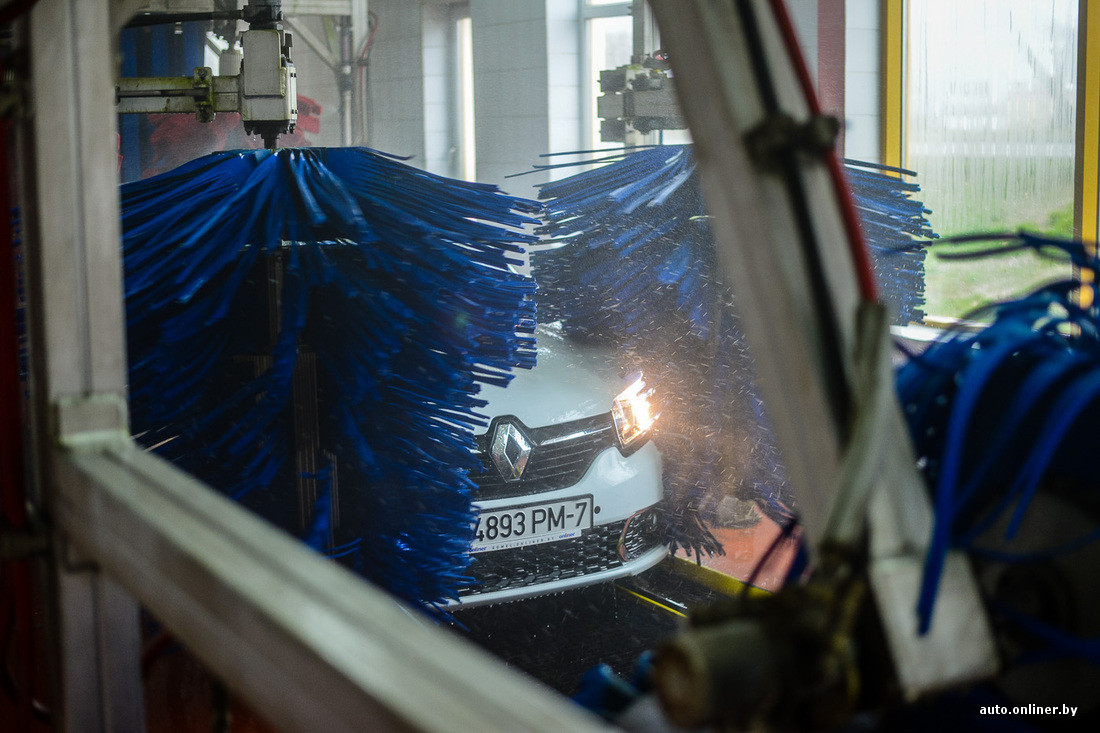 Описание технологии слегка затянулось. В этом случае проще испытать, чем понять устройство. Отправляем Renault на линию и засекаем время. Вскоре лобовое стекло полностью покрывается пеной, приходится умерить любопытство. Обзор вновь отрывается только при ополаскивании. Наблюдая, как последняя капля медленно поднимается вверх по стеклу, а сотрудники мойки протирают остатки воды, нажимаем кнопку таймера. На экране — 3:47.