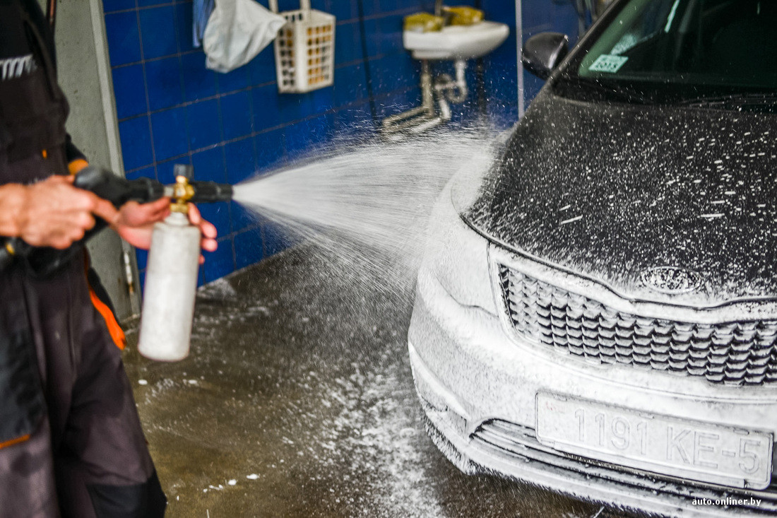 «Далее в дело вступает пена. Она покрывает кузов, одновременно размягчая щетки из микрофибры, — показывает мужчина. — Затем наносится ополаскиватель, который снимает пену и ускоряет сушку. После автомобиль попадает под струи тефлона, призванного защитить ЛКП, и „воска“, придающего блеск. Финальная стадия — сушка».