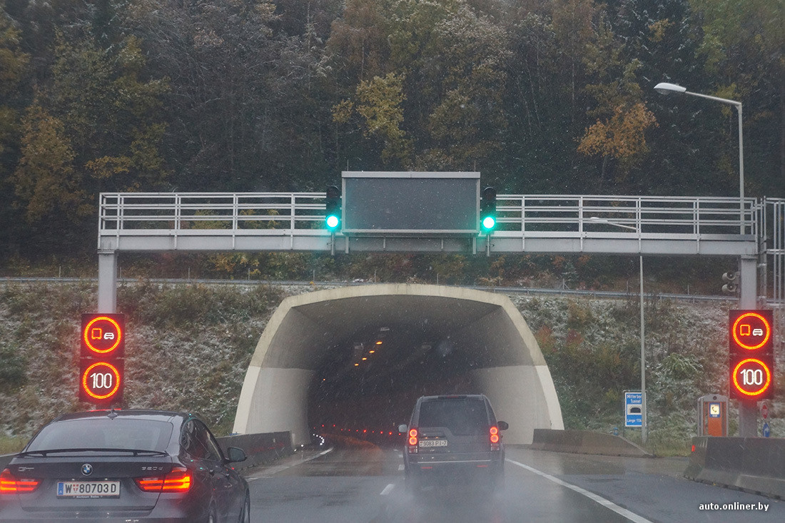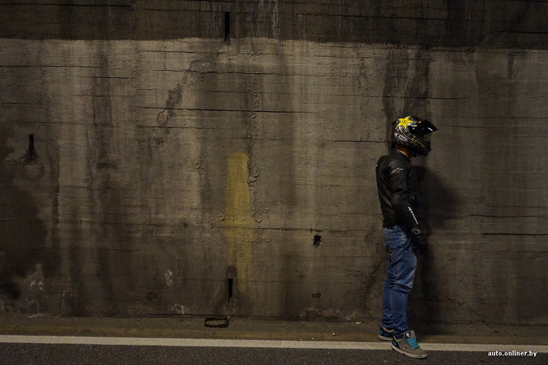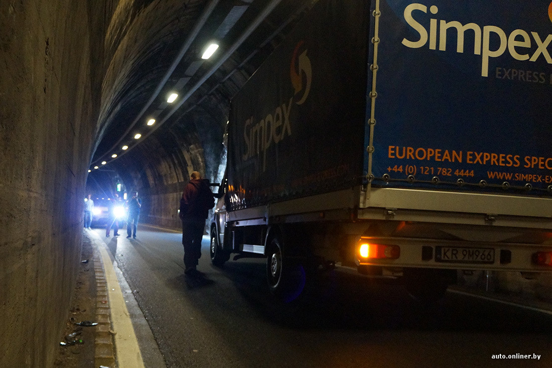 Эйфория сменилась тревогой, когда мы заметили последствия ДТП, случившегося прямо в тоннеле: грузовик из Польши недостаточно приблизился к правому краю, отчего прижал легковушку к стене. Движение на полчаса остановилось. Как видно по осколкам зеркал, коими усыпана вся дорога, здесь такое — далеко не редкость.