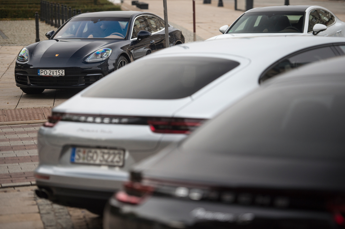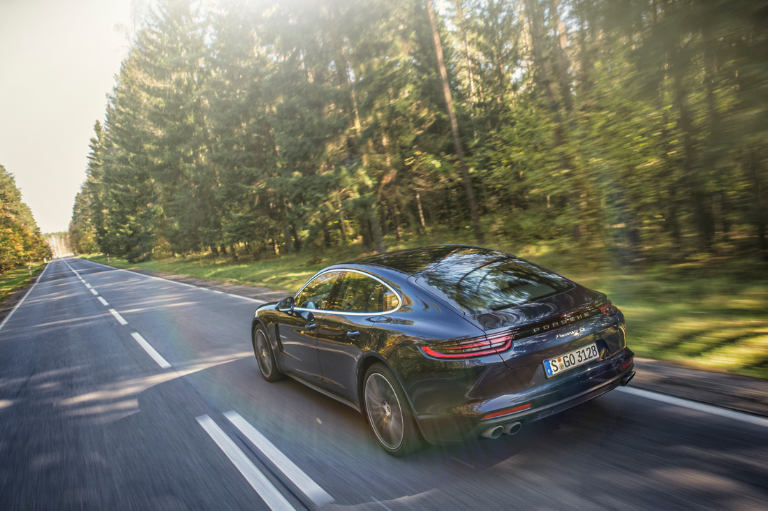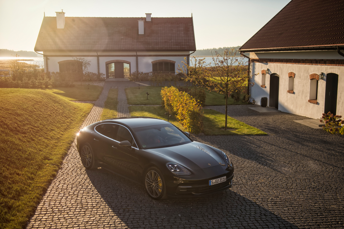 Стартуем из Варшавы на «базовой» Panamera 4S — это полноприводное шасси с 6-цилиндровым 2,9-литровым V-образным бензиновым двигателем с двумя турбинами мощностью 440 л. с. и крутящим моментом 550 Н·м. Разгон до сотни — 4,2 секунды. Неплохо для «базы». При запуске мотор сочно рыкает, а опциональная спортивная выпускная система по нажатии кнопки обеспечивает рычание еще и во время движения. Режим «Спорт» добавляет спецэффекты при переключениях передач и под сброс газа. Звук в целом и спецэффекты чем-то напоминают 911, те же 6 цилиндров, турбины и рабочий объем 3 литра. Только двигатель в Panamera V-образный, а не оппозитный.