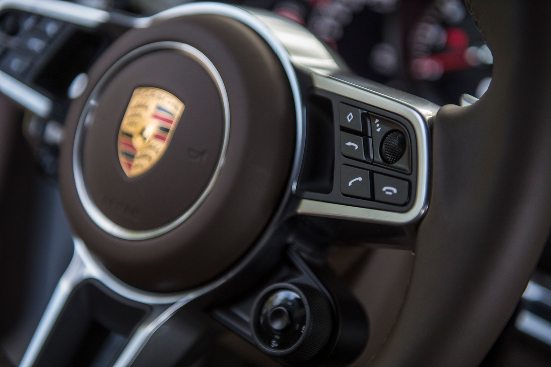 По традиции ключ для запуска находится слева, а большой аналоговый тахометр — по центру панели, но все остальное совершенно новое. Вместо четырех круглых колец приборов со стрелками рядом с тахометром теперь два настраиваемых 7-дюймовых экрана, в центре передней панели — широкий 12,3-дюймовый сенсорный дисплей. Наконец-то электроника Porsche пришла в соответствие со временем. Предыдущая система, которая еще буквально пару лет назад ставилась на все модели, не выдерживала никакой критики.