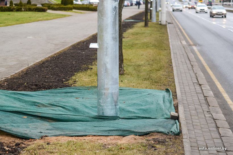В последние дни на столичном пр. Победителей стали активно проходить плановые работы по замене столбов уличного освещения. Речь идет о травмобезопасных опорах с энергосберегающими лампами.