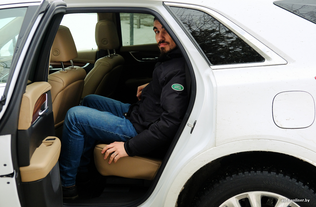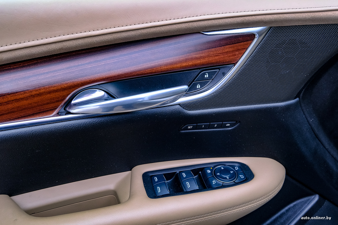 Сама мультимедийная система работает неплохо. Времени знакомиться с интерфейсом не было, но то, что успел «потыкать» на 8-дюймовом сенсорном экране, выглядело достойно. Внешне кажется, что блок климат-контроля тоже сенсорный. Но клавиши здесь требуют небольшого нажатия. Материалы отделки салона — на высшем уровне. Повсеместная дорогая кожа, редкие породы дерева, замша, глянец (маркий). Селектор коробки передач напоминает BMW. Алюминиевые дверные ручки словно сняты с классического Cadillac. На приборной панели — здоровенный дисплей.