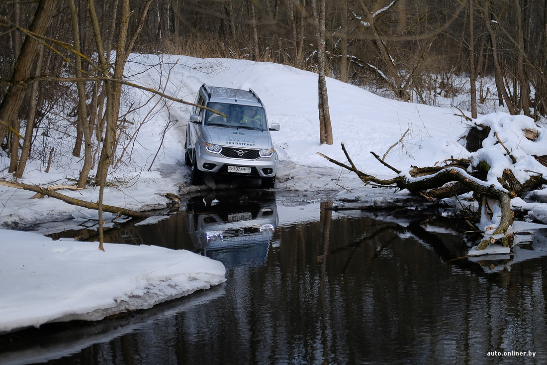 Ближе к вечеру полями/лесами доехали до речки. По следам вижу, что организаторы тест-драйва уже пробовали преодолеть водную преграду пару дней назад. Глубина — полметра. Для UAZ это «семечки» — клиренса хватает. Главная проблема ждала нас на том берегу — плотный ледяной нарост: Patriot легко выбрался из воды, а вот потом началось «веселье». Первая же «Буханка», последовавшая по следам «Патриота», соскользнула по льду и ударилась боковой частью о выступающий берег. Сломан бампер, помяты три кузовные детали, ужас в глазах представителей дилера. Зацепили фургон тросом и вызволили из беды. Остальные автомобили отправили в объезд. Вторая попытка проехать брод на новом Patriot не увенчалась успехом. Заледенелый берег уже был хорошо отполирован колесами и водой, и забраться на него оказалось невозможно. В итоге пришлось звать на помощь поврежденную «Буханку».