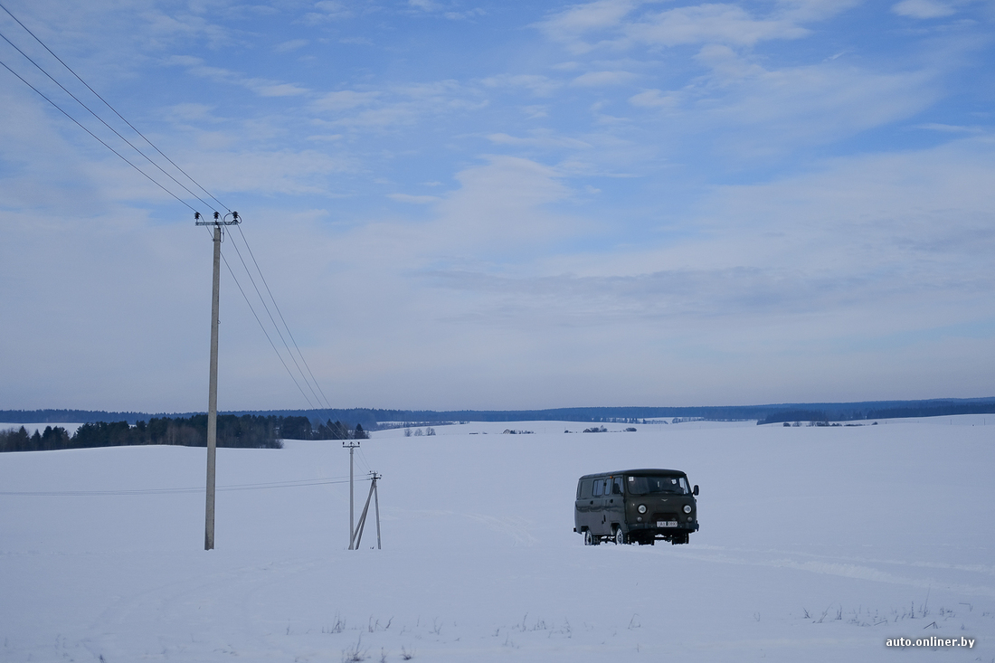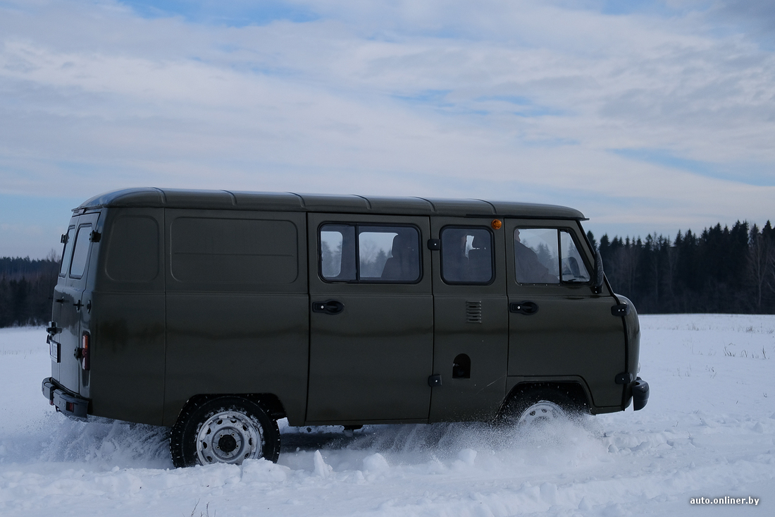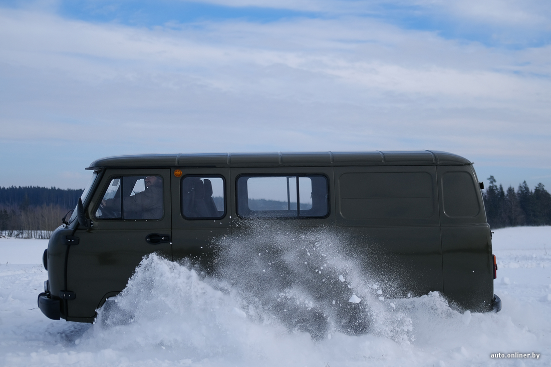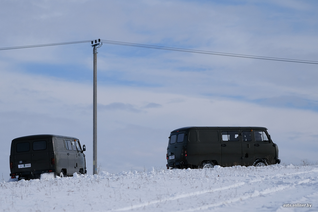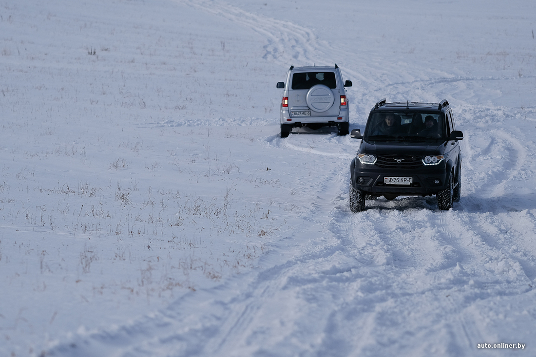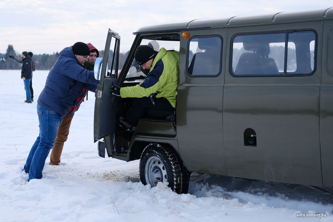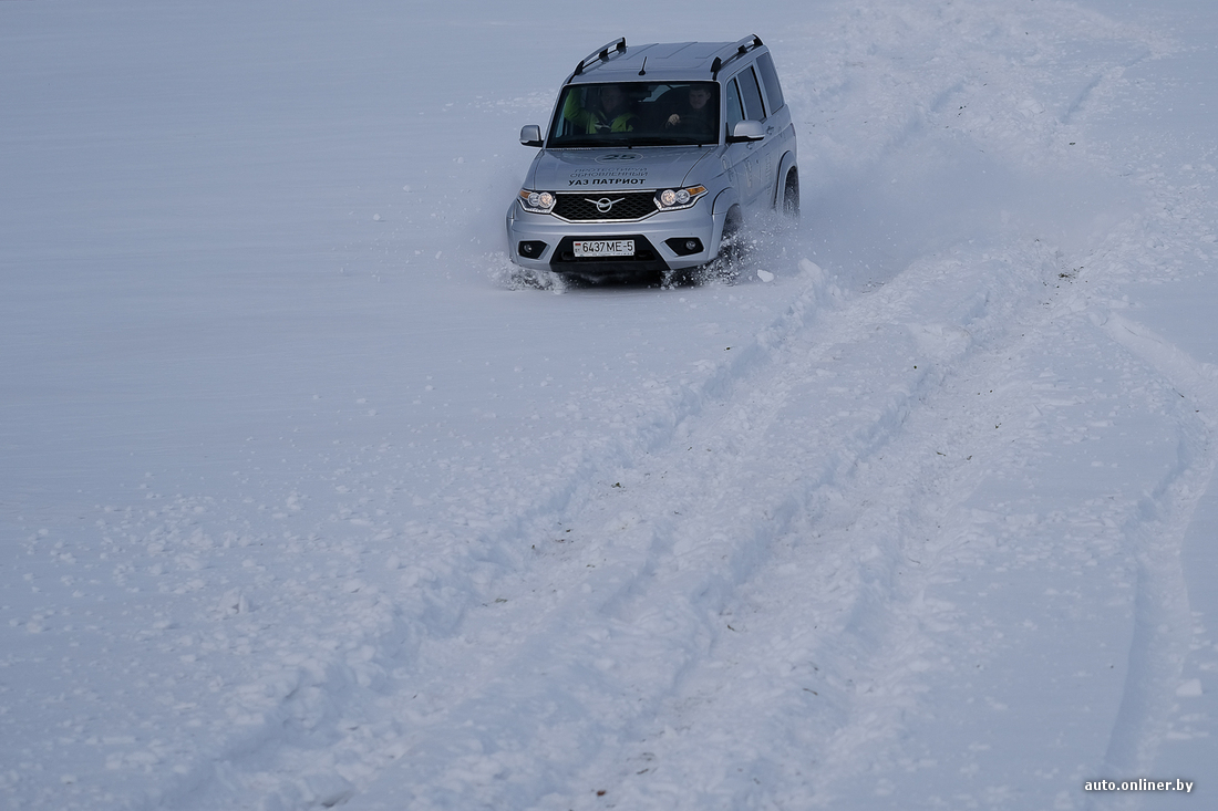 Первая же атака сугробов закончилась тем, что забуксовал дорестайлинговый Patriot. Водитель слишком увлекся газом и посадил машину на брюхо. Инструктор «УАЗ-Школы 4×4» Павел Козловский провел краткий инструктаж касательно езды по снежной целине: «Если автомобиль едет — газуйте. Как только чувствуете, что начали буксовать на месте, — бросайте газ. Иначе посадите машину на сугроб днищем». Урок усвоили не все — и обе «Буханки» тоже вскоре забуксовали.