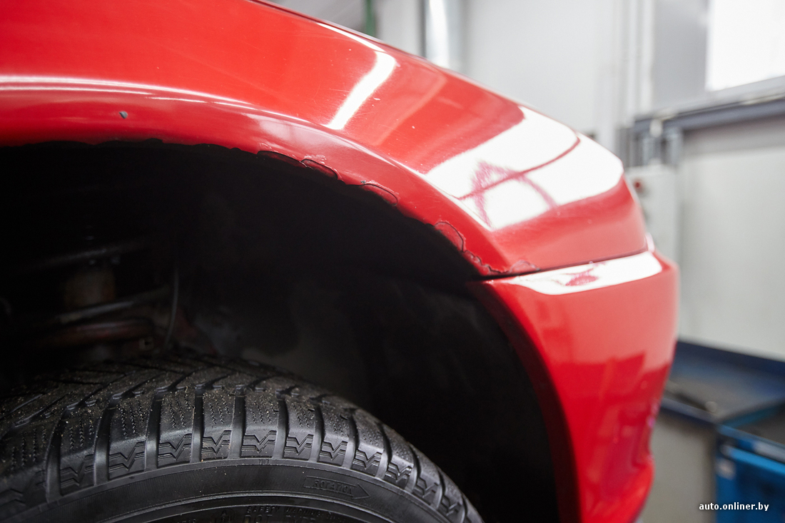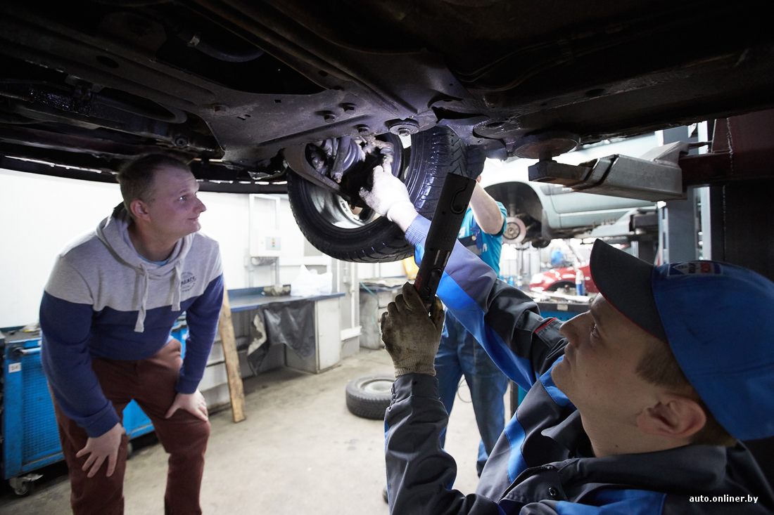 Осмотр подвески указывает на разбитую шаровую опору спереди справа, порванный пыльник трипода, вышедший из строя левый ступичный подшипник. Также мастер заметил подтеки моторного масла на сальнике коленвала. Еще одна неприятность — задние тормозные колодки слева сильно изношены.