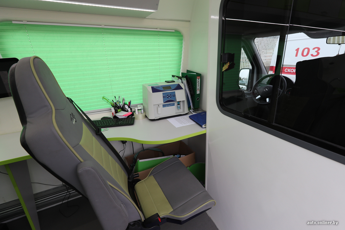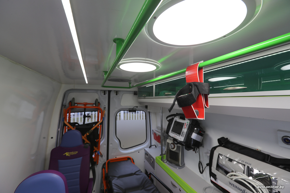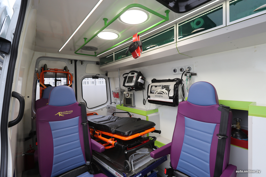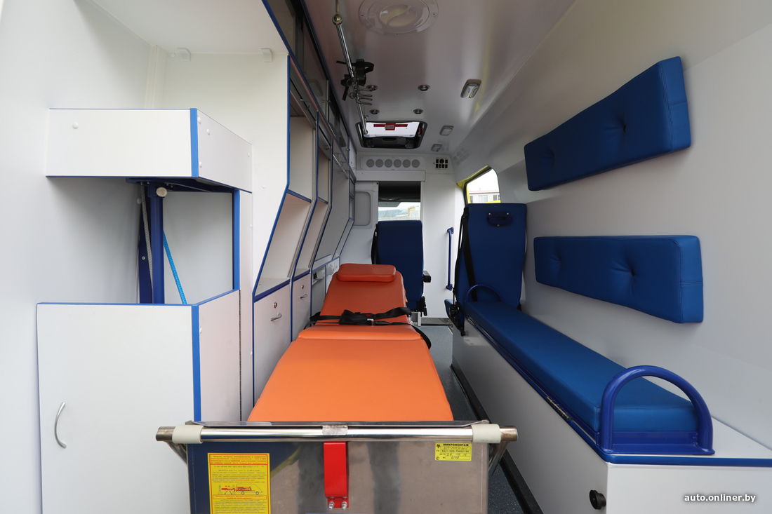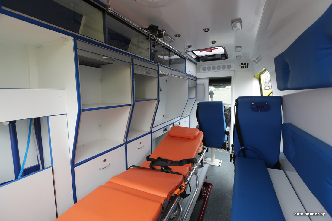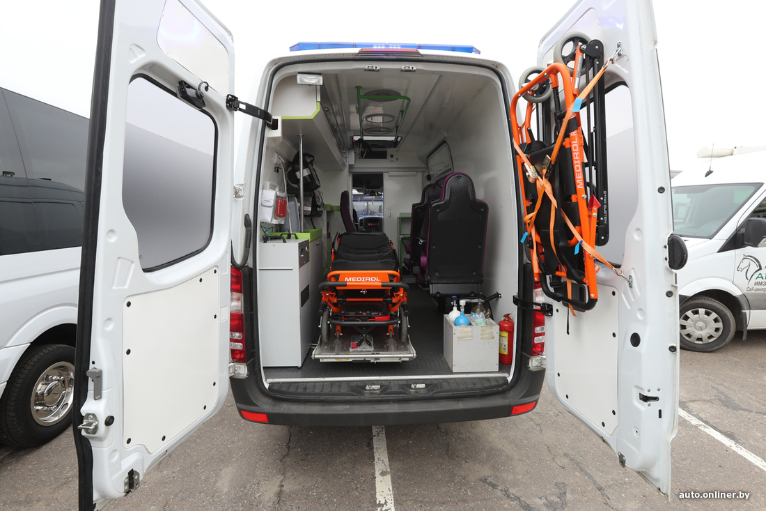 Еще в Минск прибыл автомобиль скорой медицинской помощи Sprinter Classic российского производства. Это реанимобиль класса С. Салон оснащен полной термо-, шумо- и виброизоляцией, на полу — влагостойкий линолеум, на стенах — композитные панели. Для медицинской техники и препаратов предусмотрены шкафы, антресоль, столешница, в которой установлен умывальник. Система газопроводов подведена к закрытому шкафу с двумя газовыми баллонами по 10 л каждый.