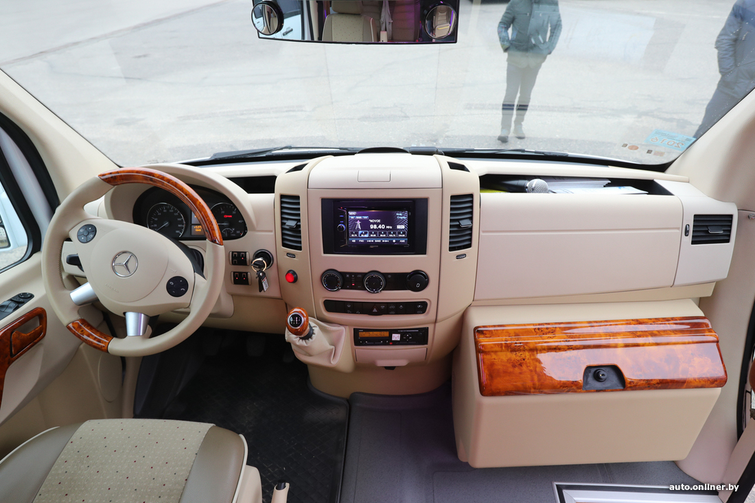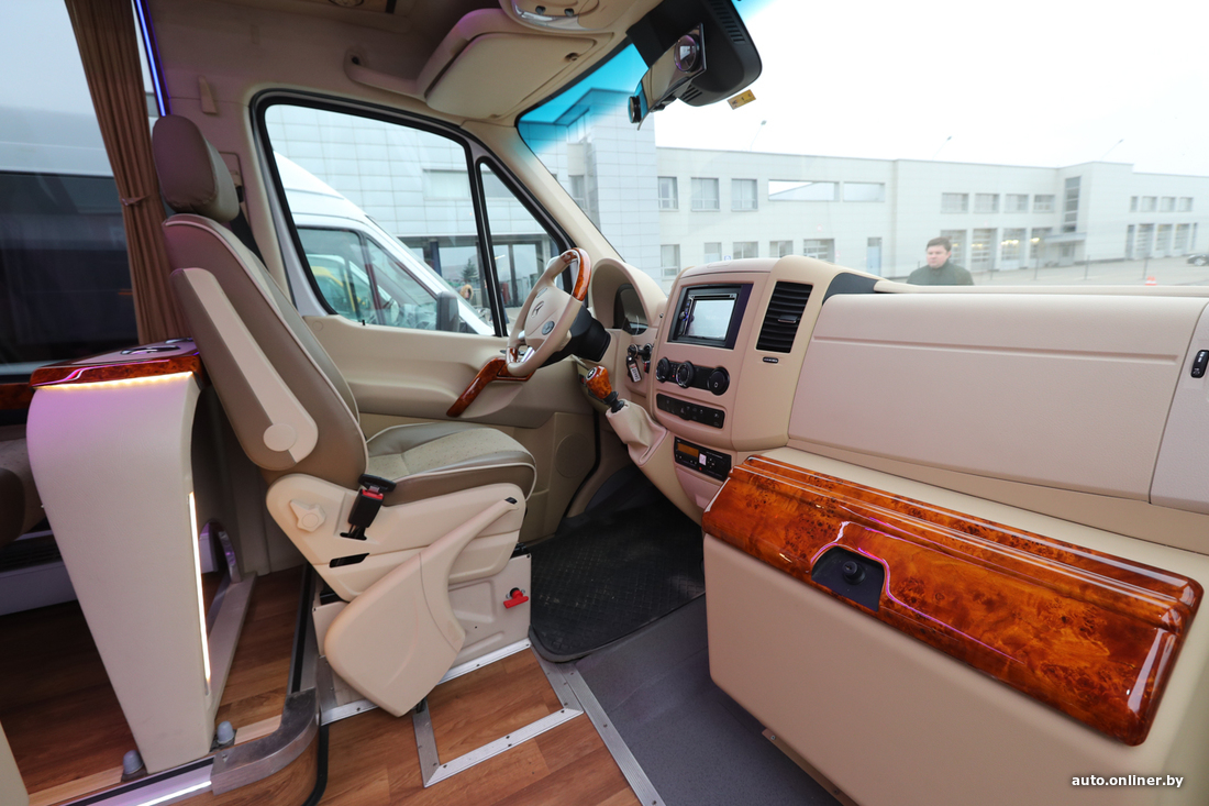 Еще на выставку привезли мобильную лабораторию и несколько VIP-версий «Спринтера». Один из экземпляров подготовила минская компания ЧТУП «Рент Бус»: на базе грузового Mercedes Sprinter они сделали бизнес-микроавтобус с дорогими креслами (на фото — со светлым салоном), подсветкой, индивидуальной регулировкой кондиционера и пр.