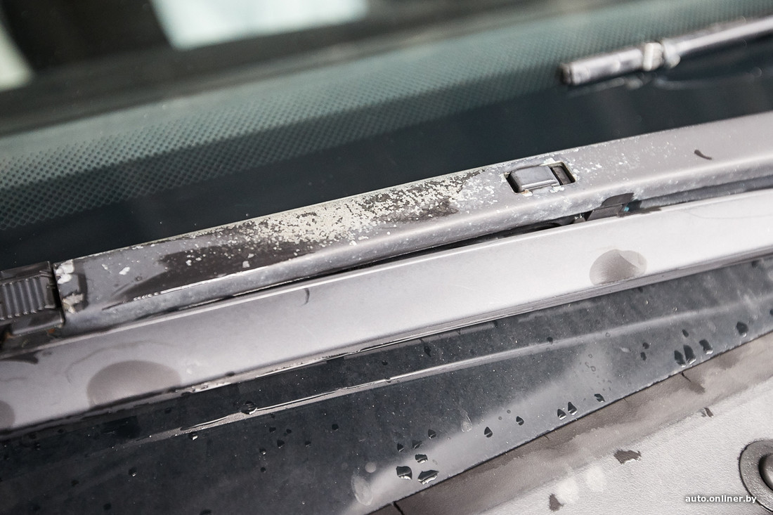 Нюансы кузова. Соль не пощадила «шильдик» BMW на капоте, оставила следы на щетках стеклоочистителя. Однако ржавчины нигде не видно. Передние фары выглядят мутновато. Павел говорит, что их испортили во время шлифовки — стерли верхний слой лака. Под определенным углом заметно отличие в ЛКП на левом переднем крыле — как признался владелец, там устранялись «жучки», краску не успели отполировать. Также на капоте обнаружили пятно непонятного происхождения.