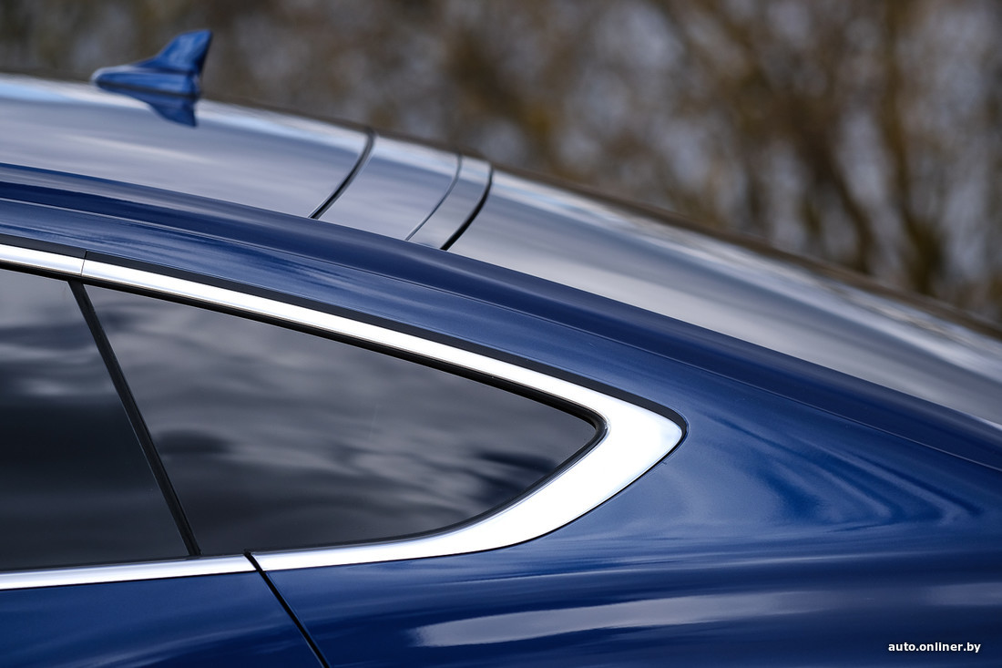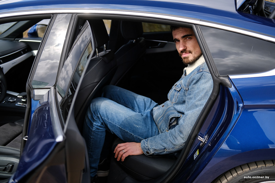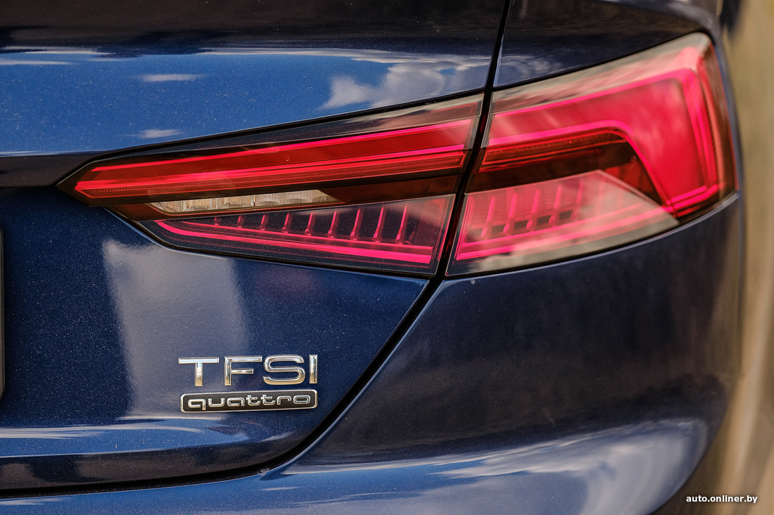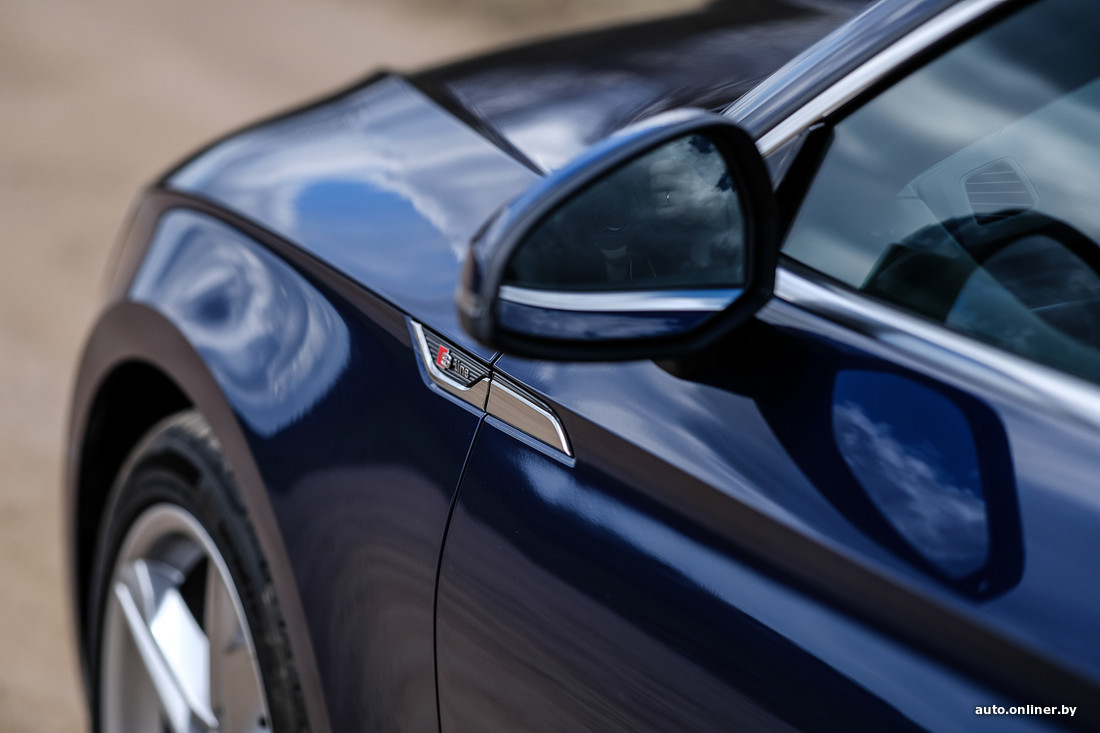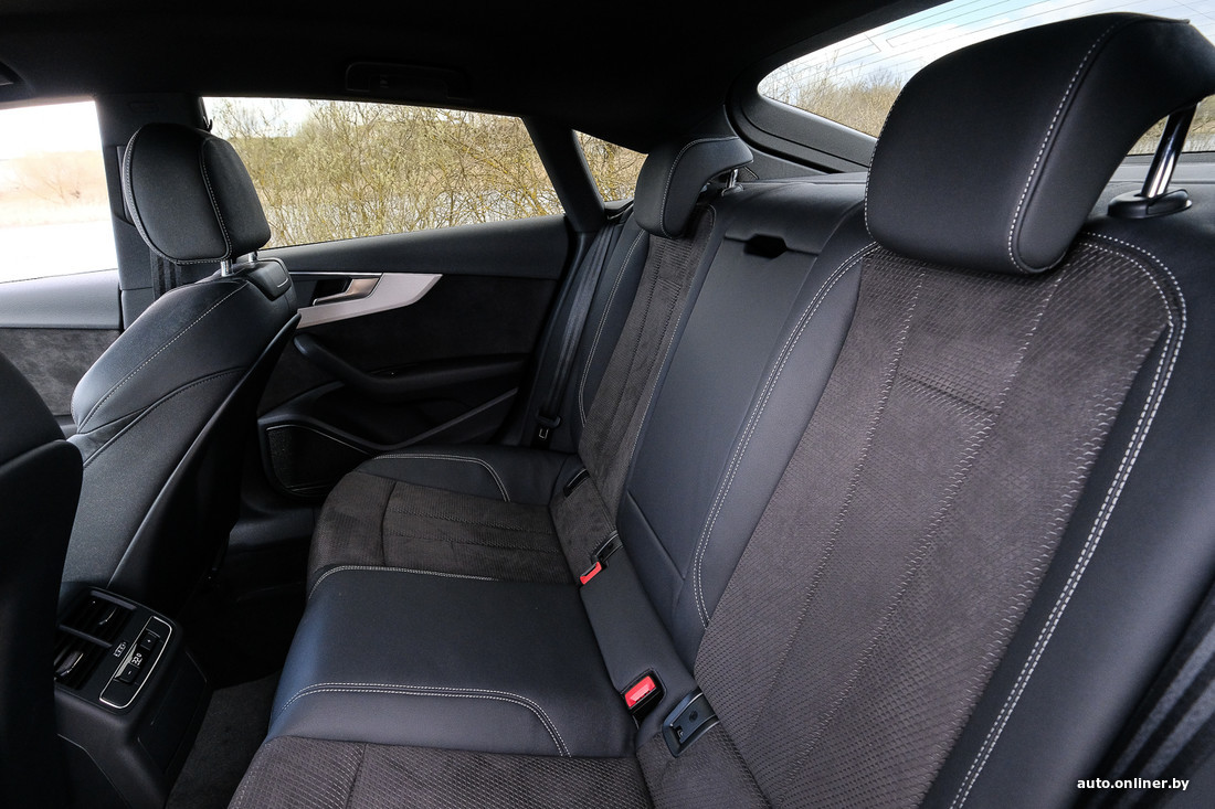 В поворотах A5 Sportback словно скорый поезд. Скорее водитель забоится увеличивать скорость, нежели автомобиль начнет скользить. На руле — приятное и чистое усилие, наливающееся по мере увеличения скорости в вираже. В Audi говорят о «тонких настройках» платформы А4, но по ощущениям машина сильно отличается от стандартного седана. На тестовом автомобиле, повторюсь, спорт-подвеска. Лично я пойму людей, которые не захотят за нее доплачивать. Да, с ней A5 Sportback очень устойчивый и не менее драйверский, чем иной BMW. Но наши дороги пока не так хороши, чтобы рассекать по ним на подобной машине. Если вы иногда съезжаете с главных минских проспектов и поездка за город для вас — это не всегда поездка в аэропорт, то наверняка вы будете часто сетовать на излишнюю жесткость спортивной ходовой. Важно отметить, что на тестовом автомобиле были 18-дюймовые колеса, а бывают еще 19- и 20-дюймовые.