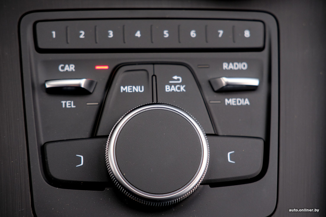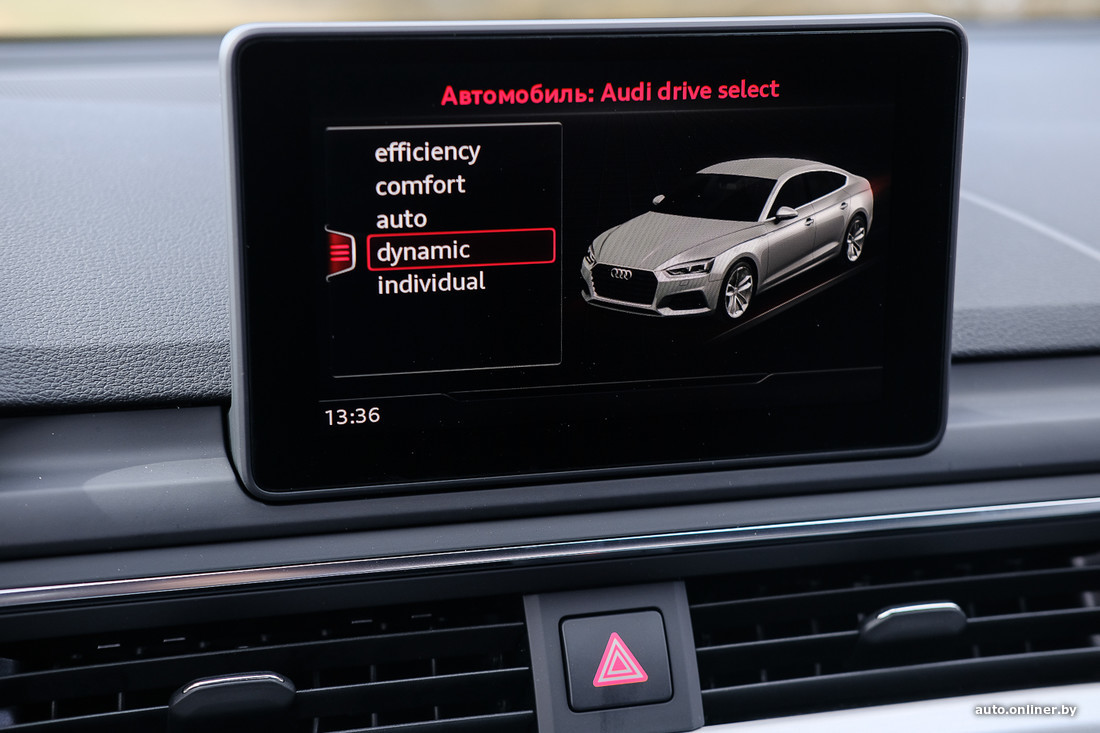 Интерьер А4 перекочевал в А5 практически без изменений. Тестовый лифтбэк «приправлен» пакетом S-Line, который включает в себя здоровский руль с перфорированной кожей, комбинированные (кожа/алькантара) спортивные кресла с электрорегулировкой, накладки на пороги и др. В целом интерьеры последних новинок Audi хорошо сочетают в себе современные технологии и навязанный руководством концерна консерватизм. Здесь нет упрямого следования традициям, как у BMW, но и «мерседесовского» гламура с обилием лака и глянца здесь тоже не найдешь. В общем, можно сказать, что салоны Audi — самые «немецкие» среди конкурентов. Сдержанность и высокотехнологичность в одном флаконе. Правда, штатная мультимедийная система весьма простенькая. К графике на дисплее вопросов нет, но размер маловат, да и в эпоху седьмого iPhone в машинах хотелось бы видеть что-нибудь более современное (это придирка не только к Audi). Как и A4, новый А5 можно заказать с полностью цифровой приборной панелью. Но и аналоговая с цветным экраном между «кругляшами» спидометра и тахометра выглядит отлично. Правда, в базе другая приборка — с черно-белым дисплеем.