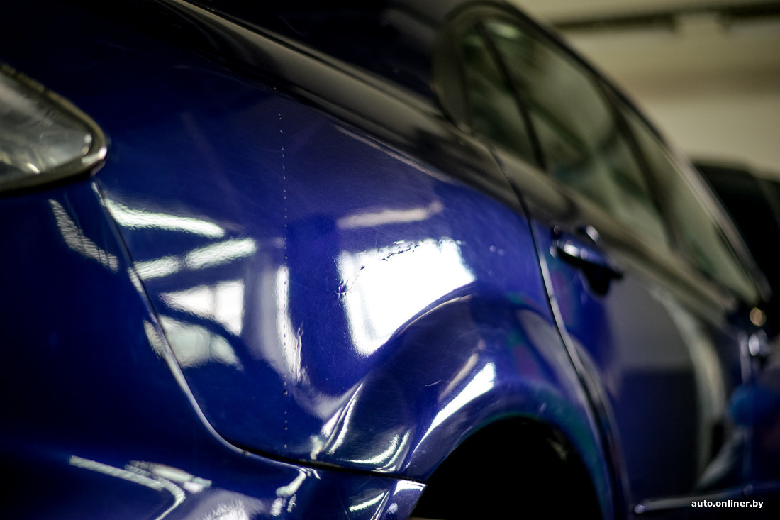 Осмотрев машину со всех сторон, мы заметили несколько неприятных нюансов: виден шов, оставшийся после восстановления арок, на переднем и заднем бампере заметны царапины. Кроме того, на заднем виднеется сквозная дырка размером с фалангу пальца. На крышке багажника и нижней кромке дверей — следы коррозии. Местами бросается в глаза шагрень неотполированной краски, определенно не родной. Электроподъемник водительской двери работает некорректно — при кратковременном нажатии стекло не поднимается до конца. Также заедает механизм закрытия крышки багажника.