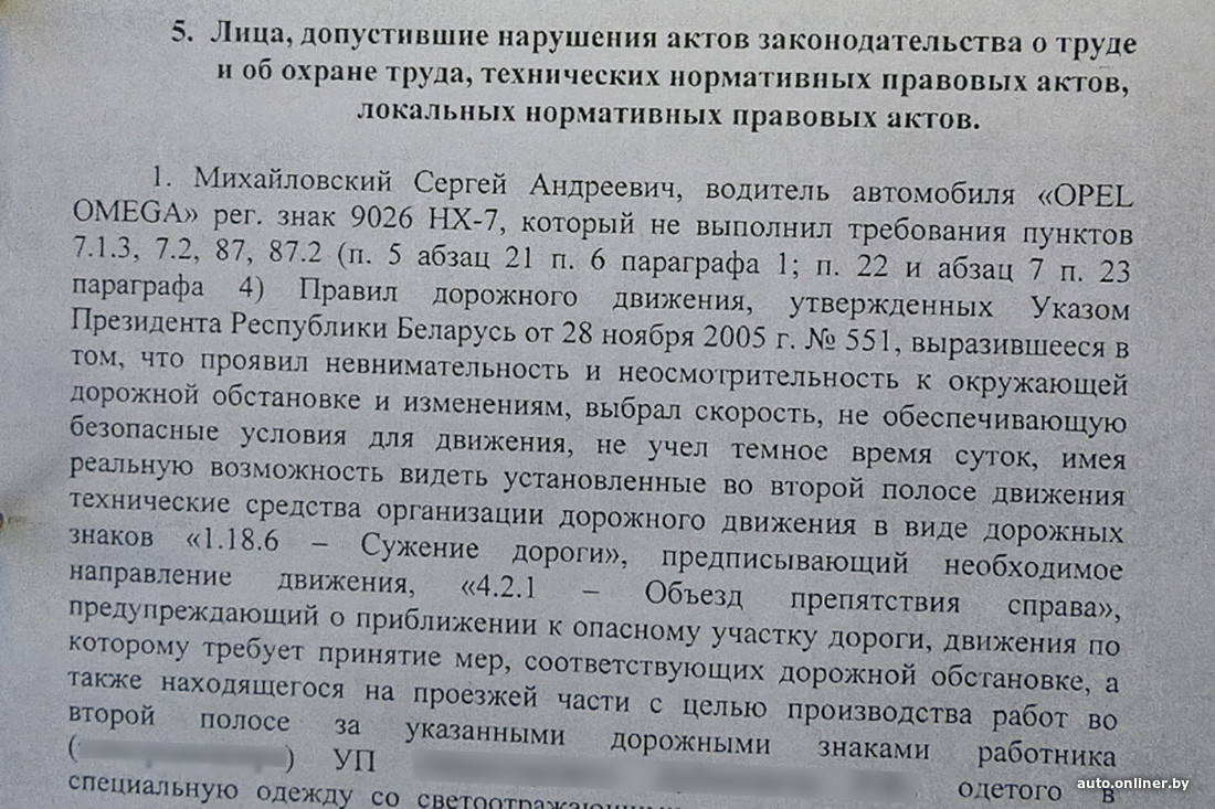 Сергей Михайловский, посоветовавшись с юристом, решил обжаловать акт о несчастном случае на производстве. Документ составлен сотрудниками Департамента государственной инспекции труда. Там много говорится о действиях водителя Opel и их квалификации. В основном используются стандартные формулировки из уголовных дел о ДТП: проигнорировал требования знаков, не принял меры по снижению скорости, не справился с управлением, совершил наезд, грубо нарушил пункты ПДД и др.