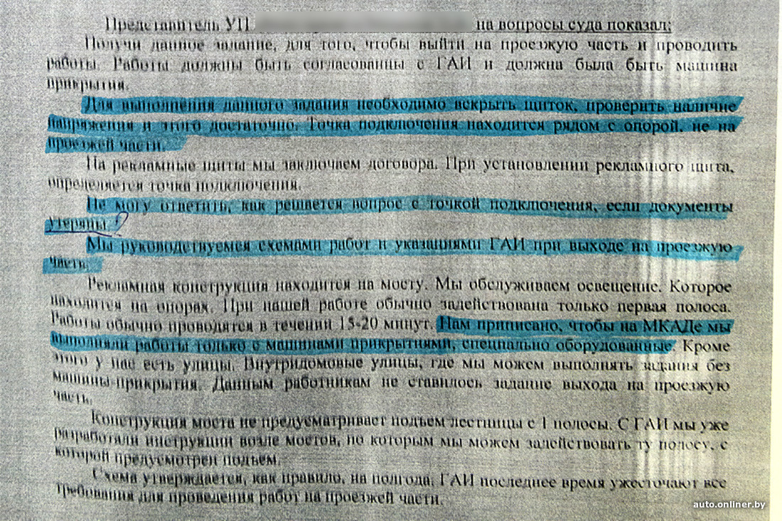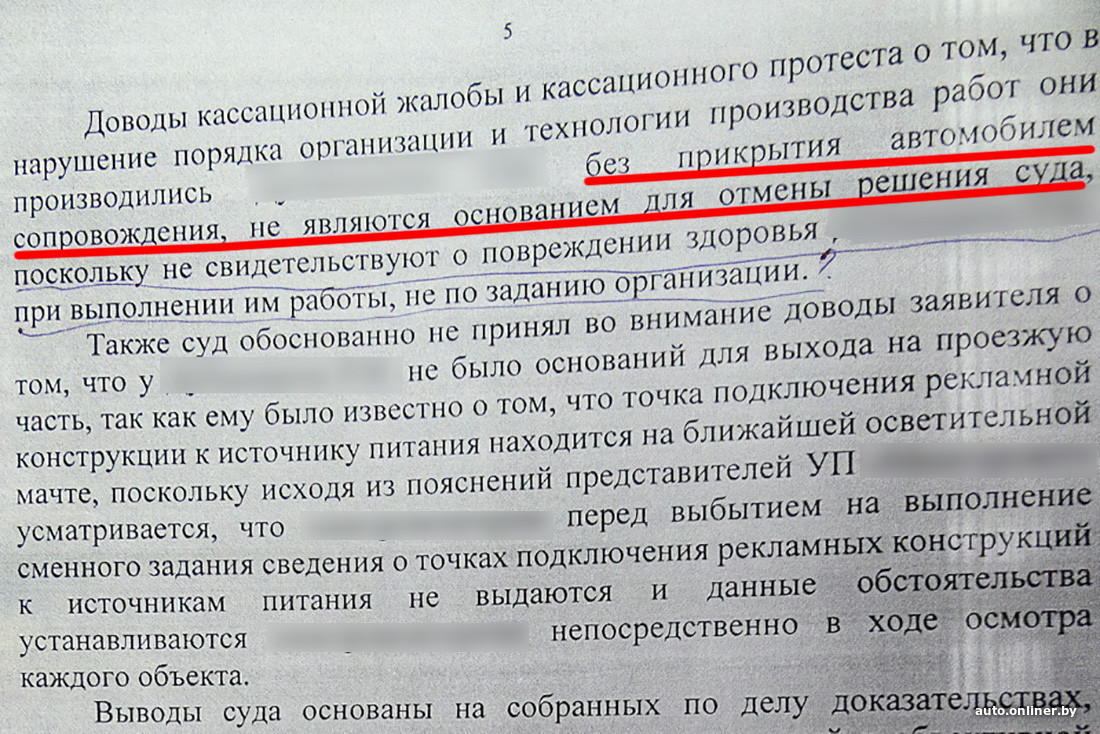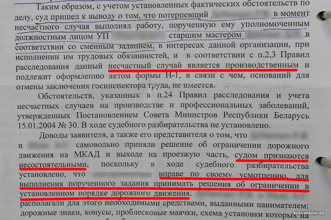 В суд также вызывали сотрудника УП, в котором работал потерпевший. Этот специалист принимал участие в служебном расследовании несчастного случая. Он подтвердил, что «они [рабочие] решили выполнить часть работы на свой страх и риск, не согласовывая работу с мастером». «Мы изначально посчитали, что данная работа им не была поручена. Выход на проезжую часть им не поручался», — обосновал представитель предприятия.