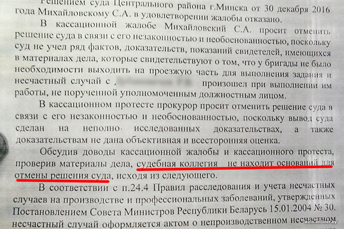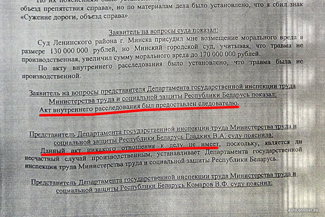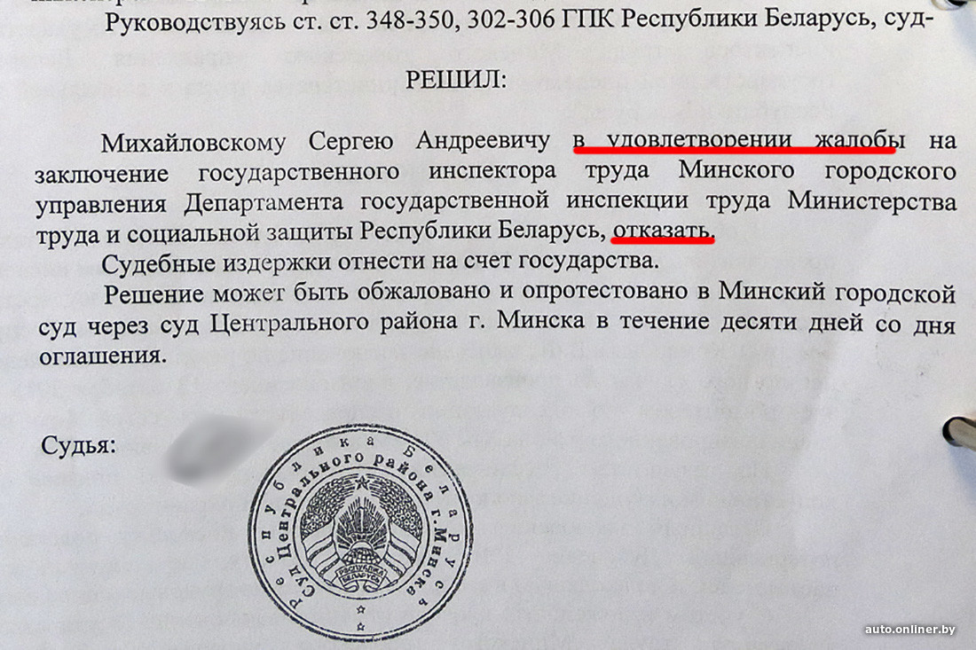 Несмотря на все вышеизложенное, представители УП, в котором работал потерпевший, и Департамента государственной инспекции труда посчитали жалобу водителя Opel необоснованной и не подлежащей удовлетворению. В итоге суд Центрального района Минска отказал Сергею Михайловскому.