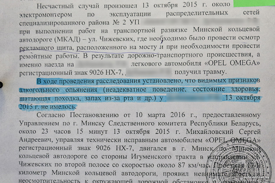 Вкратце напомним хронологию. В октябре 2015-го Сергей Михайловский возвращался после второй смены домой. Около 23:15 Opel Omega двигался по внешней стороне МКАД (от Игуменского тракта к ул. Чижевских). Водитель перестроился из крайнего правого ряда в средний, затем, увидев на проезжей части мужчину, попытался предотвратить ДТП, но увы... После этого автомобиль выехал на обочину, вернулся на кольцевую дорогу и врезался в отбойник.