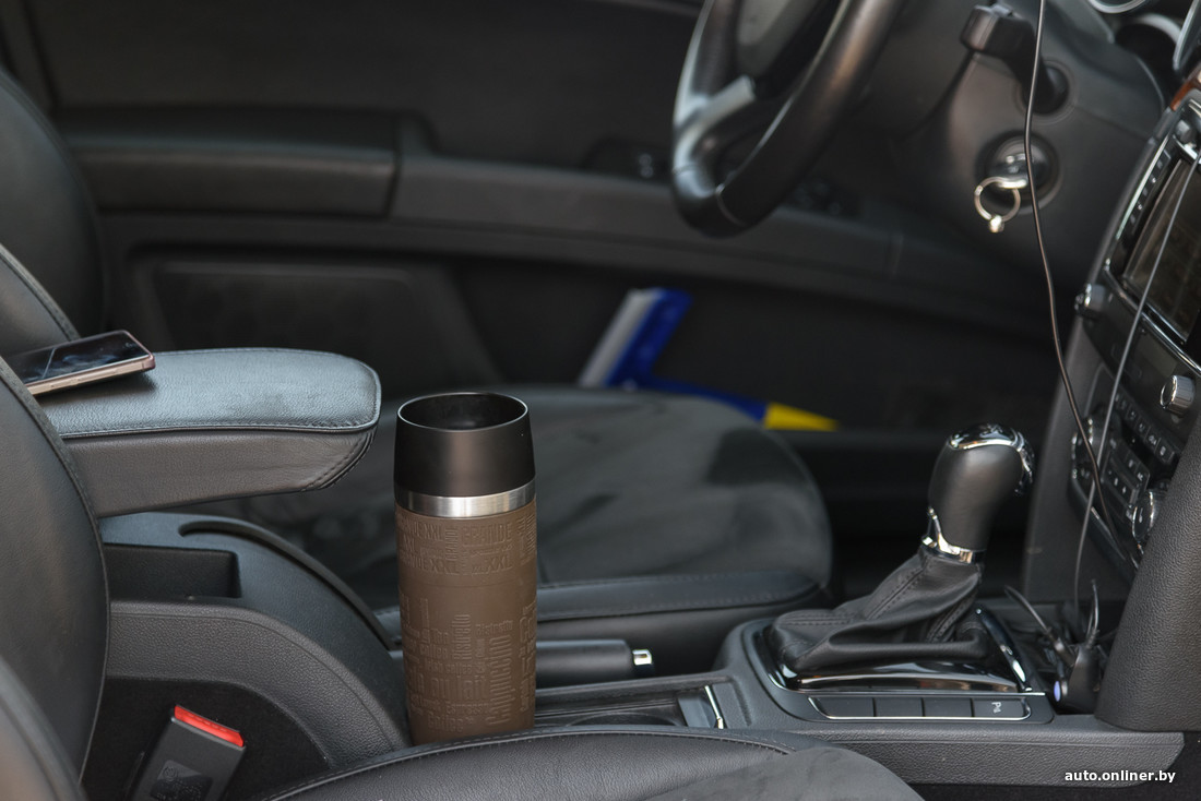 Продолжаем осматривать салон. Вот термокружка — утром она всегда наполняется кофе с молоком. По опыту нашего собеседника, напиток остается горячим долгое время (маленький совет: прежде чем заливать кофе, залейте кружку кипятком на минуту-две).