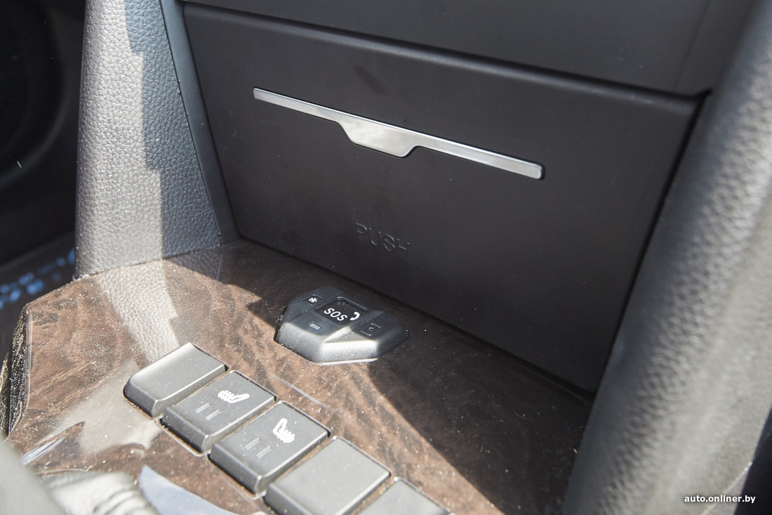 Внешне передняя консоль напоминает европейские автомобили середины прошлого десятилетия. И это хорошо. А вот центральный тоннель словно делали из бабушкиного серванта. Понятно, что создатели старались добавить «богатства» и «роскоши», но лакированный прямоугольный элемент, из которого торчит рычаг коробки, полностью выбивается на общем облике. Рядом с ручником расположилась гигантская пепельница, а вот места для подстаканников спереди не нашлось. USB- и AUX-разъемы спрятаны глубоко в нише за рычагом КП. Каждый раз при открытии этой ниши ты еще рискуешь нажать на кнопку «ЭРА-ГЛОНАСС», которую почему-то разместили у основания центральной консоли, а не на потолке.