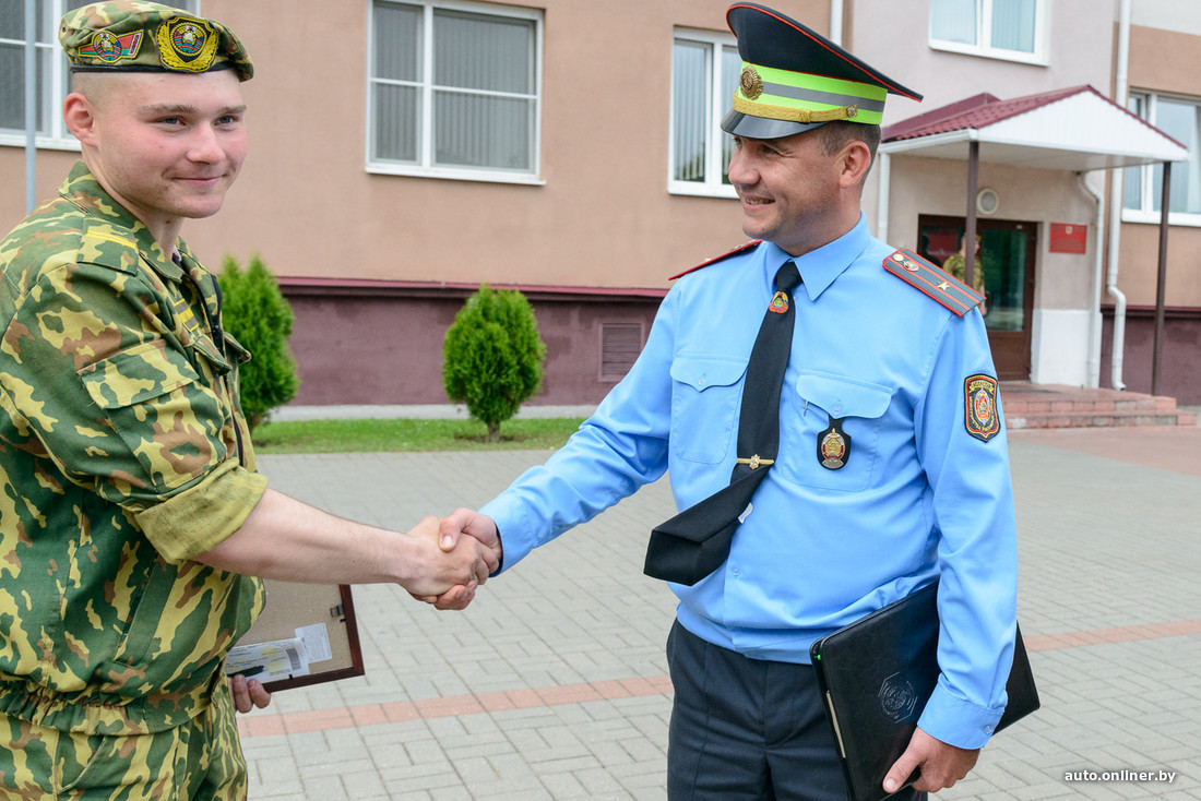 А сейчас заслуженная минута славы. Перед строем сослуживцев младшего сержанта поздравляет руководитель пресс-службы ГАИ города Сергей Зараник: «Если внимательно просмотреть ролик, то можно заметить женщину, убегавшую с ребенком, и еще несколько человек, которые могли пострадать от действий агрессивного мужчины. Сергей не остался безучастным, а его действия говорят о хорошей подготовке. Браво!»