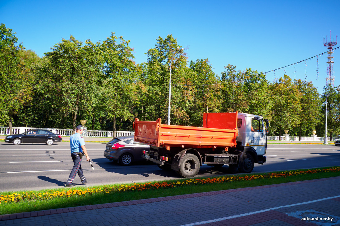 Вместе с экипажем ГАИ Минска мы приехали на проспект Независимости, остановились возле долгостроя, который заслонил вид на Свислочь. Утро буднего дня. Хорошо виден поток автомобилей, которые спускаются со стороны Октябрьской площади в направлении улицы Янки Купалы. В крайнем правом ряду должны двигаться только маршрутные транспортные средства: полоса обозначена соответствующим образом, нанесена разметка, установлены знаки. Так в чем же проблема?