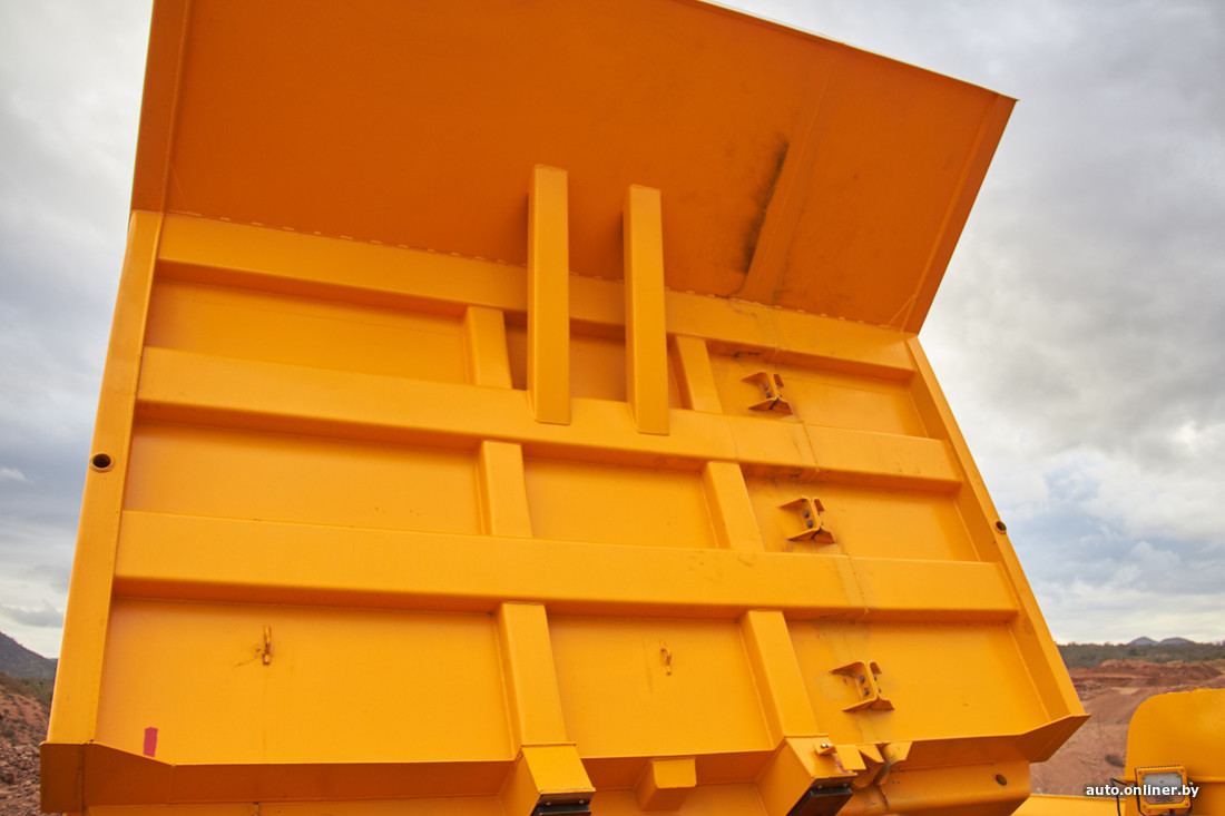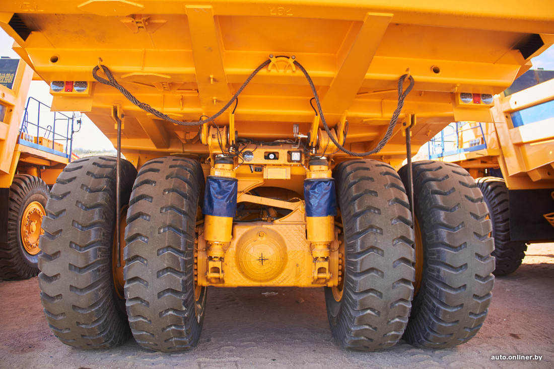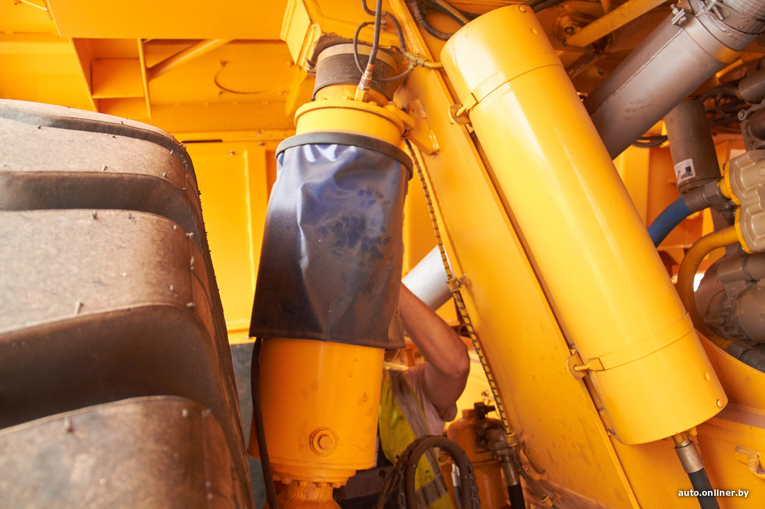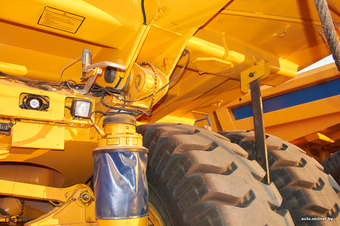 Полная масса самосвала — более 95 тонн (40 тонн самой машины плюс 55 тонн груза) — требует особой подвески. Здесь она гидропневматическая. В качестве газа используется азот, потому что тот же воздух слишком быстро нагревается и расширяется. Поэтому подвеску «заряжают» из баллона.