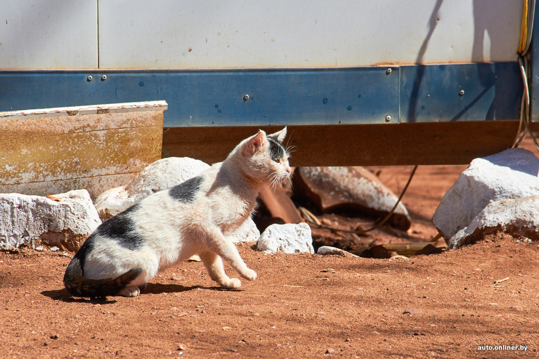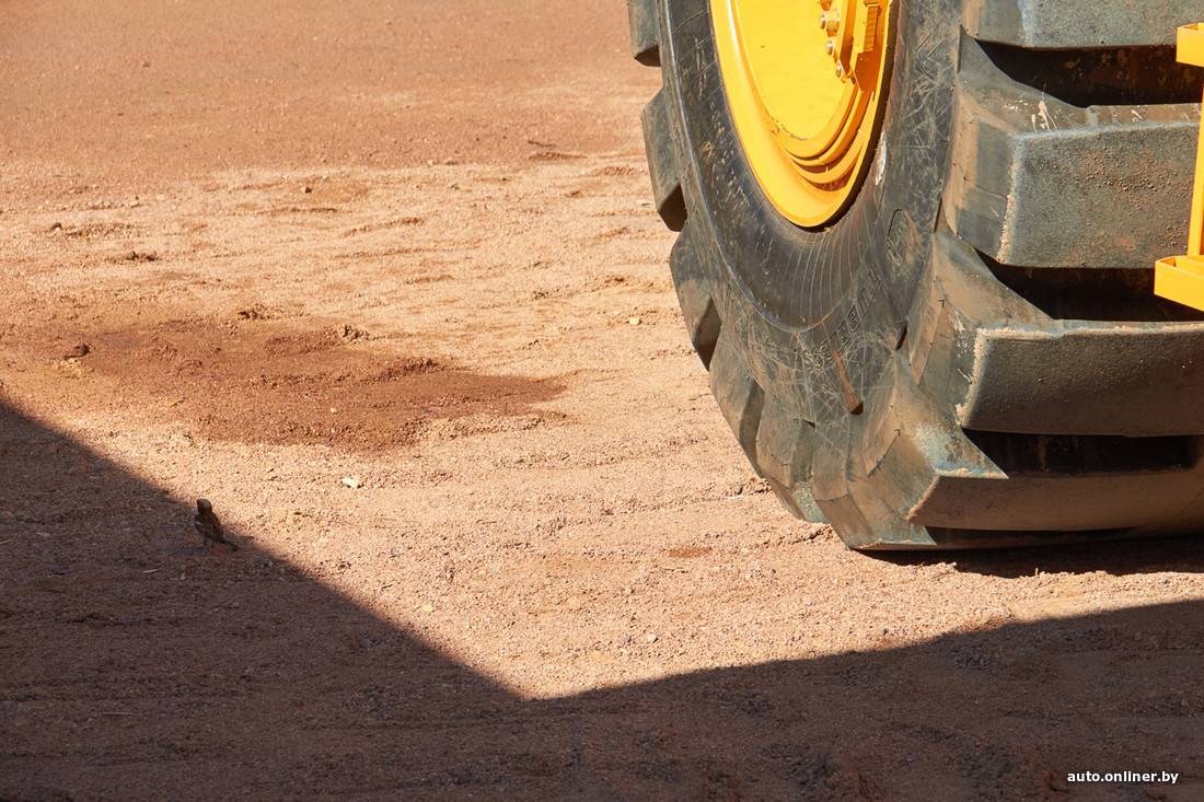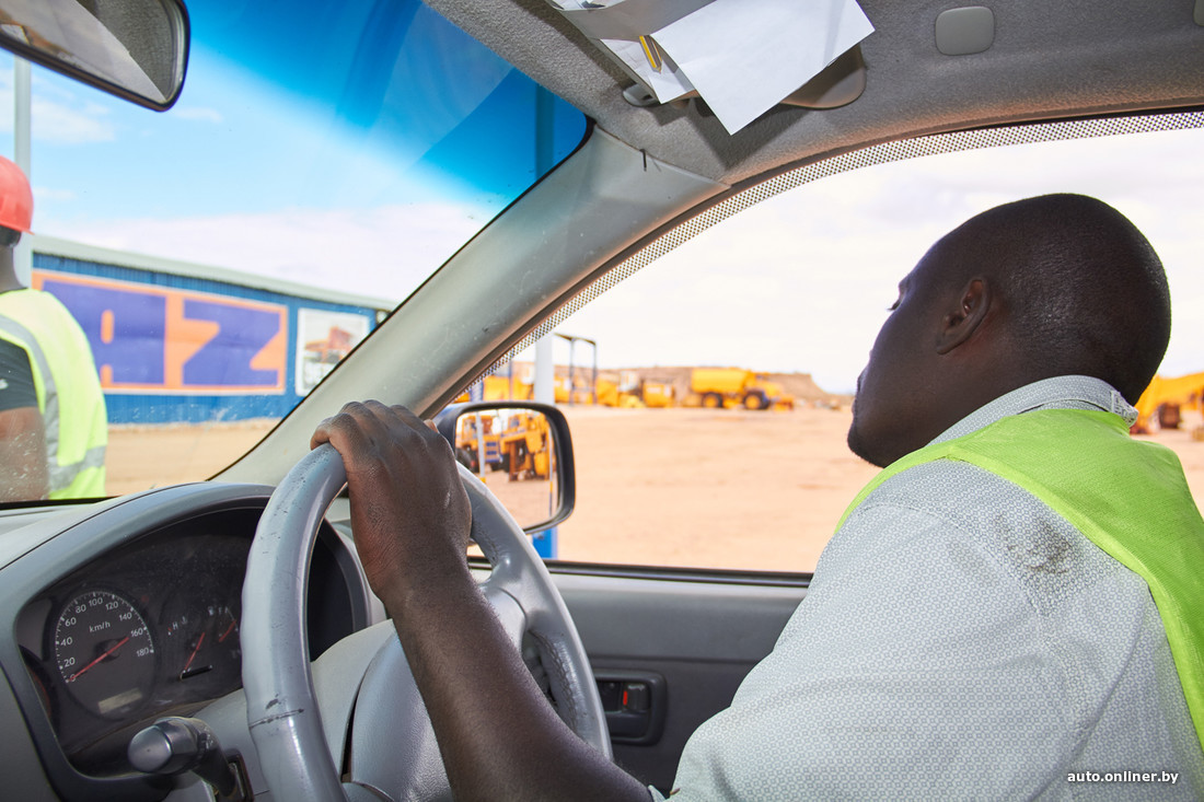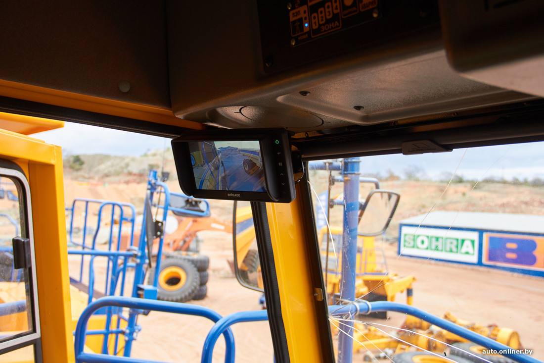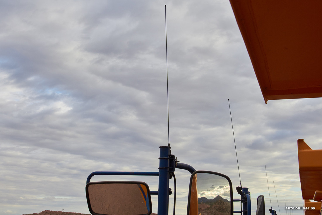 Говорят, управлять БелАЗом несложно, рулежка сравнима с легковушками — современные системы позволяют. Но вот почувствовать габариты нелегко. Чего стоит один факт: правое зеркало находится в другом от кабины конце палубы, в трех шагах от водительского места. Для безопасности правый борт оснастили камерой. Еще одна стоит сзади. Изображения выводятся на отдельный монитор в кабине. Благодаря камере замечаю даже африканского воробья, скрывшегося от жаркого солнца в тени БелАЗа.