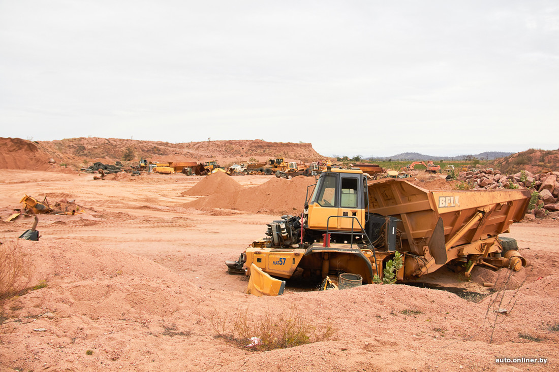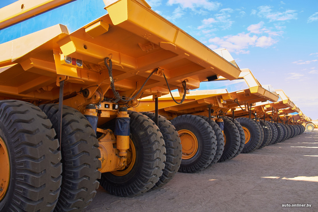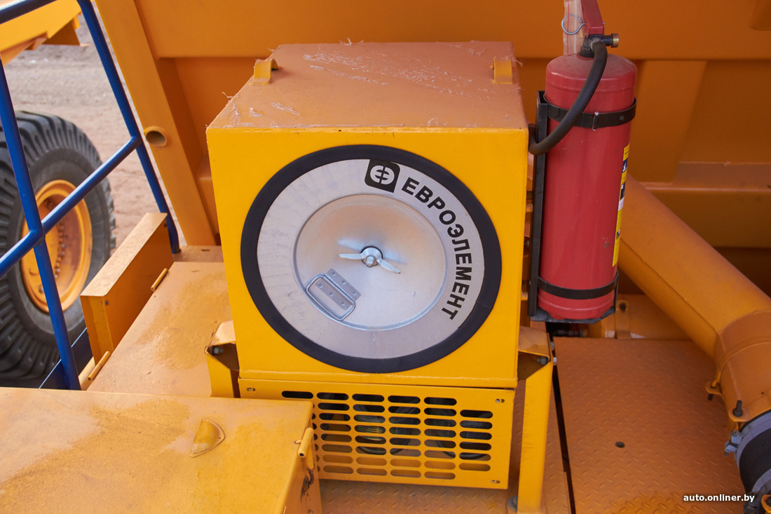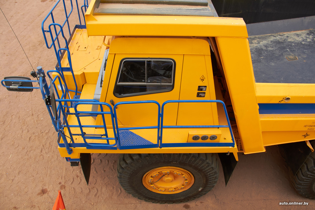 Из кабины высокого 55-тонника виден край этой свалки. То, что посадка тут высокая, очевидно и для тех, кто ни разу не водил автомобиль размером с дом. Строгое правило: подниматься по лестнице в кабину нужно только лицом к машине, бывали случаи падения с неприятными последствиями. По просьбе водителей установили специальную лампу, освещающую лестницу, — на случай, если работы закончились после заката. Выключить ее можно с помощью кнопки, скрытой в переднем бампере. Тут же, на бампере, можно заметить и один из редких элементов, не имеющих белорусского гражданства, — противотуманку. Мы поинтересовались, каков процент использования деталей made in Belarus. Оказалось, 85%.