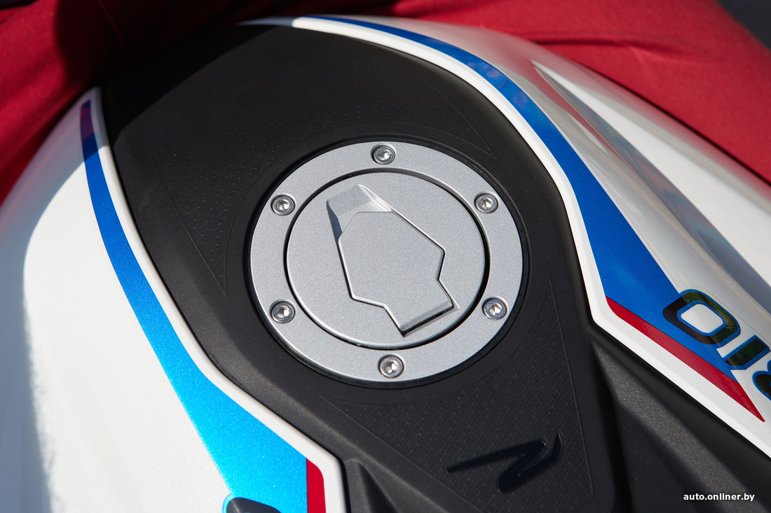 Бак имеет объем 11 литров, и при среднем расходе в 3,3 л / 100 км на одной заправке можно проехать около 300 км. Единственная деталь, к которой можно придраться в мотоцикле, — крышка бака. Она не фиксируется в открытом виде и падает под своим весом.