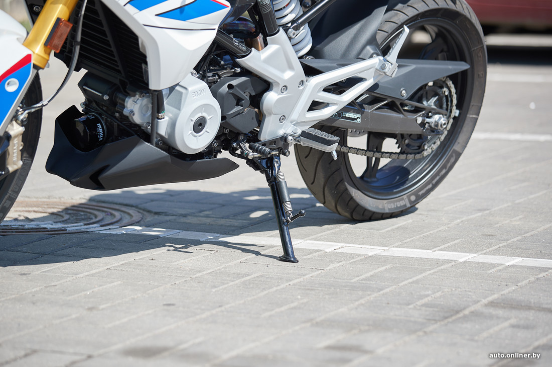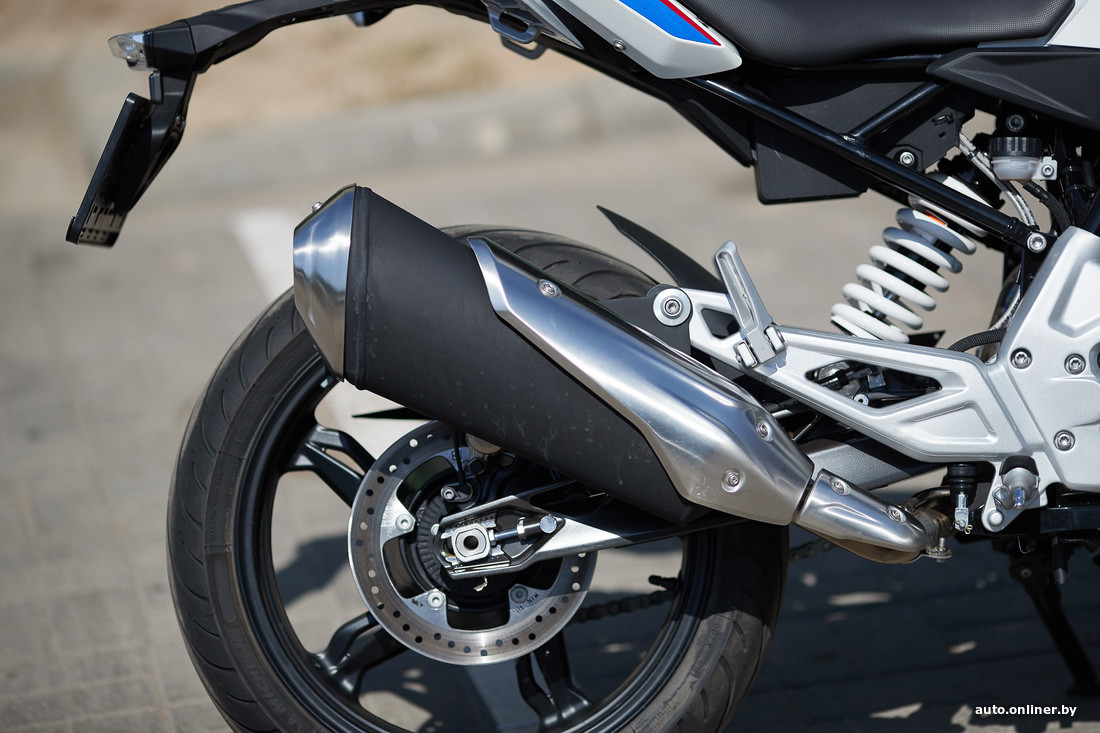 Тормоза имеют, на первый взгляд, неизвестную надпись на суппортах — BYBRE. Расшифровывается это как By Brembo. Это бюджетная версия тормозов от именитого производителя для малокубатурных байков и скутеров из азиатского и южноамериканского регионов. Для переднего колеса используется всего один тормозной диск, но тормоза работают, в общем-то, неплохо. Во-первых, байк легкий, во-вторых, он не разгоняется до высоких скоростей. Но самое, пожалуй, главное, это то, что обратная связь предсказуемая и понятная. На всех новых мотоциклах BMW система ABS идет в стандартной комплектации, и важность этой функции, особенно для начинающего райдера, сложно переоценить. В отличие от автомобиля блокировка переднего колеса мотоцикла приводит к мгновенному падению, поэтому наличие ABS является крайне важным элементом безопасности.