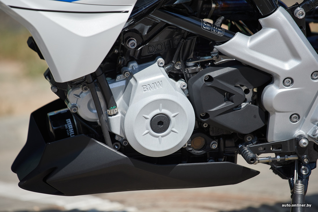 Заводится мотоцикл большой кнопкой стартера вместо ставшего стандартным для других моделей BMW небольшого переключателя. Звук на холостом ходу в стоке вызывает улыбку — как у мотороллера. Малая кубатура плюс «задушенный» выпуск стандарта Евро-4 делают свое дело. Под нагрузкой приблизительно с 4500 оборотов звук превращается в более-менее приятное звонкое «кряканье», а после 7000 — в «спортивное» завывание. Благо стандартный глушитель можно легко заменить на что-то более вдохновляющее, например на систему Akrapovic: в этом случае мотоцикл зазвучит как настоящий байк.