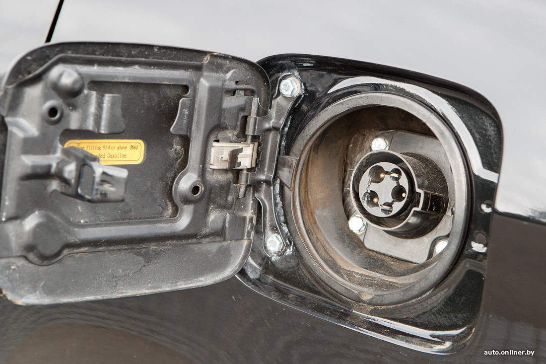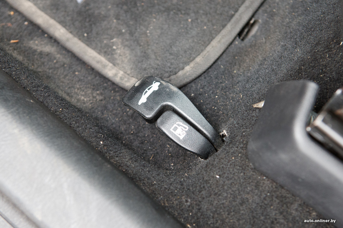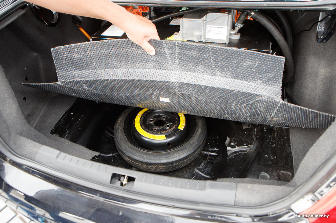 Весь багажник сейчас занимает батарея и собранное зарядное устройство, кабель к которому идет прямо из под лючка, куда когда-то заливали бензин. Теперь там разъем зарядки Type 1 Connector. Такой стандарт позволяет заряжать машину только при помощи одной фазы переменного тока. Любопытно, что лючок, как и раньше, открывается с помощью рычажка, на котором нарисована бензиновая колонка.