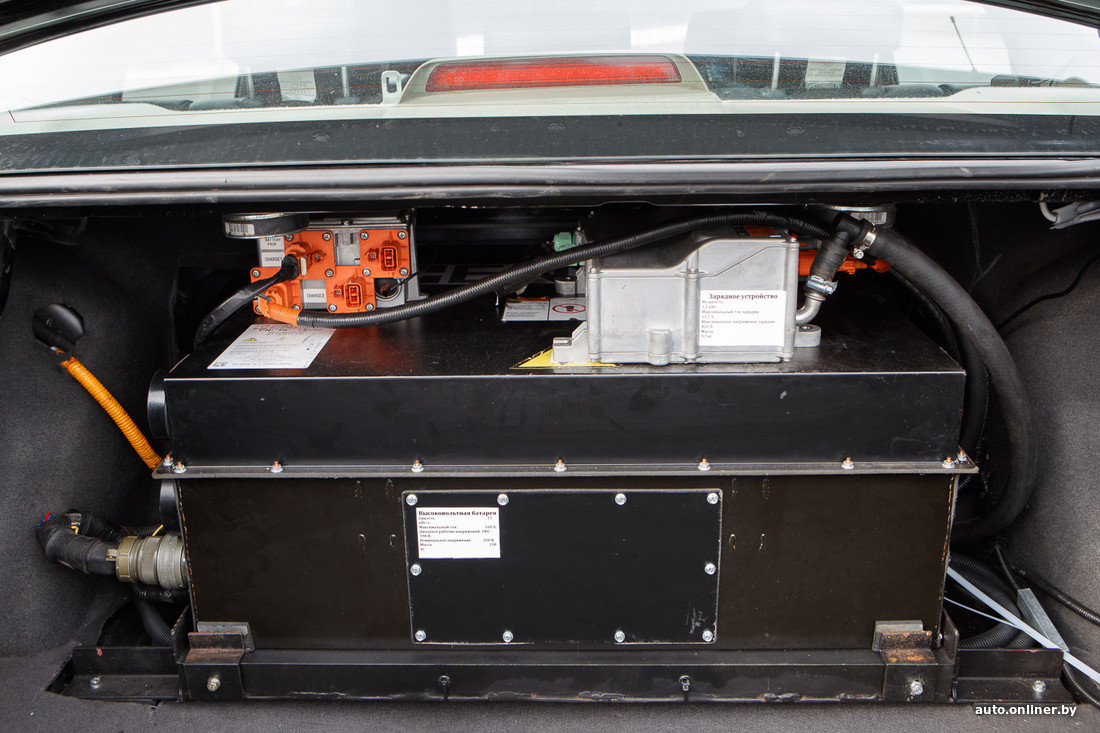 Во время первых испытаний машина разгонялась до 110 км/ч, но это не максимальная скорость. На длинной прямой мы без труда развили 120 км/ч. Вместо 1,8-литрового бензинового мотора в этом уникальном SC7 поселился электродвигатель мощностью 80 л. с. Перед создателями стояла задача сделать электрический автомобиль для города, поэтому за цифрами «л. с.» никто не гнался. По данным НАН Беларуси, емкость литий-ионной батареи гибридного накопителя — 32 А·ч.