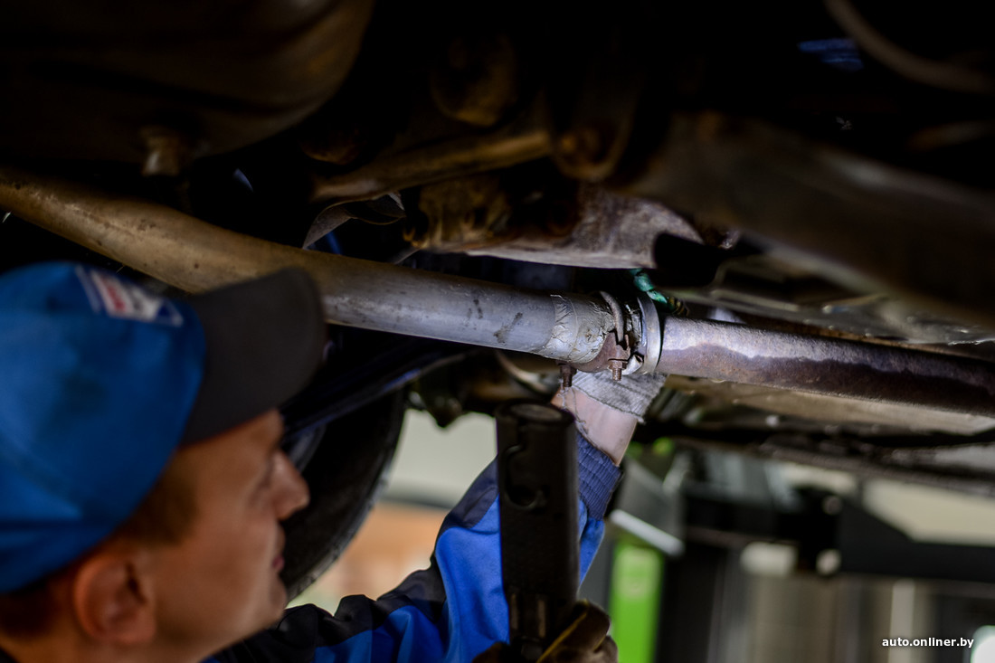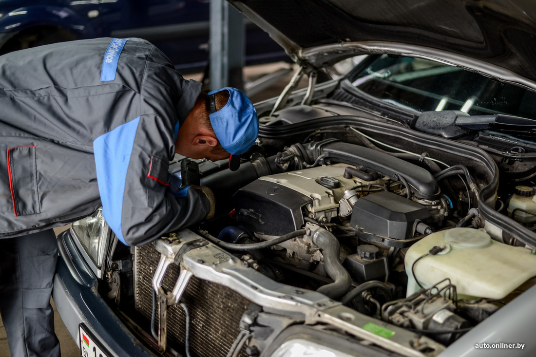 В адрес автомобиля было сказано много комплиментов. Настало время проверить, насколько приятные слова коррелируют с истинным положением дел. Специалисты СТО похвалили Mercedes за хорошее для своих лет состояние. Из недочетов кузова обратили внимание на уже указанные нюансы на дверях и крышке багажника. Также заметны царапины и сколы на заднем бампере (как утверждает Сергей — последствия парковки неизвестного героя), трещины и царапины на переднем (по словам молодого человека, мусоровоз не вписался в дворовой проезд). Во время детального осмотра обнаружили люфт плавающего сайлент-блока сзади слева, а также люфт левой рулевой тяги, которую из-за особенностей устройства модели придется заменять с трапецией. Кроме того, глушителю понадобятся сварочные работы в области между центральной частью и «банкой». Компьютерная диагностика выявила много неактуальных ошибок (видимо, процедуру давно не проводили), все, кроме одной, стерлись. Исключением стала ошибка дополнительного насоса системы охлаждения, но, по словам Сергея, печка работает исправно.