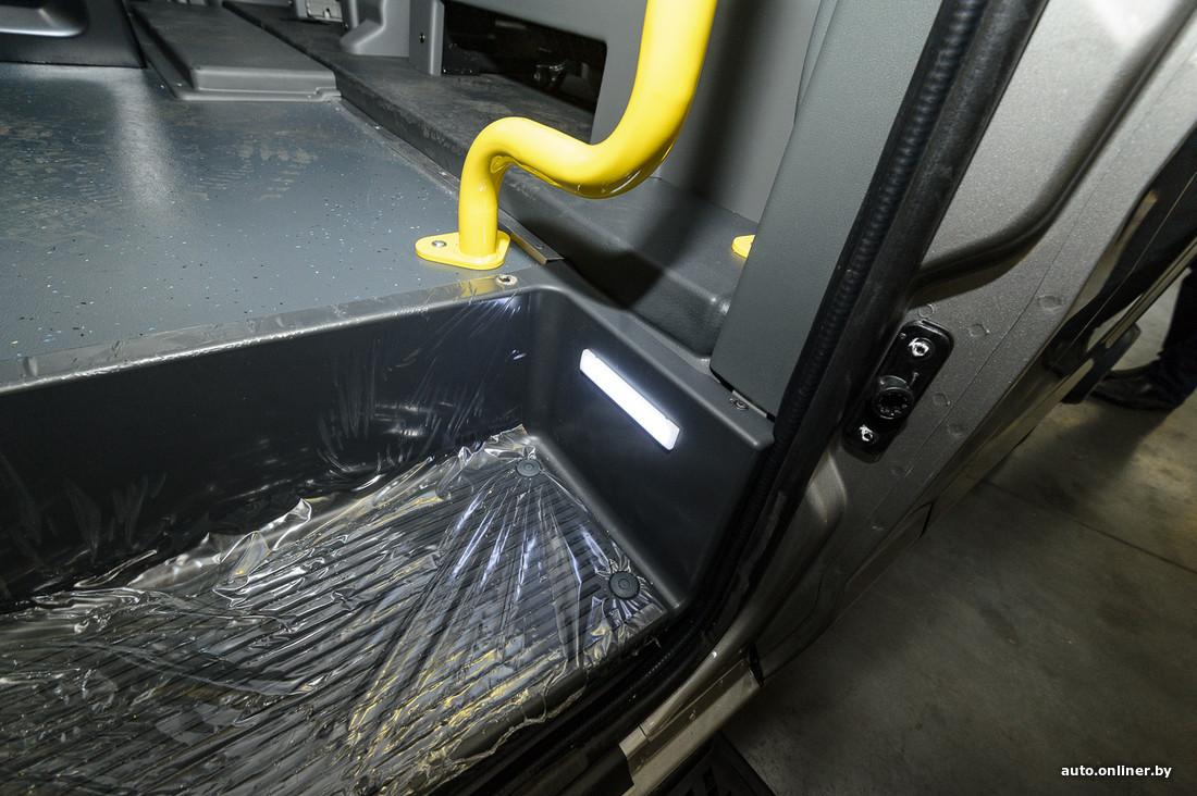 — По сравнению с обычной версией тут имеется ряд технических нюансов, — объясняет нам сотрудник пресс-службы. — В частности, установлен ограничитель скорости в 60 км/ч. Автомобиль невозможно привести в движение при открытой двери. Возле каждого сиденья находится кнопка вызова водителя. Предусмотрены трехточечные ремни.
