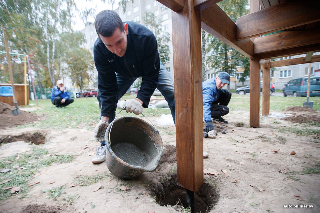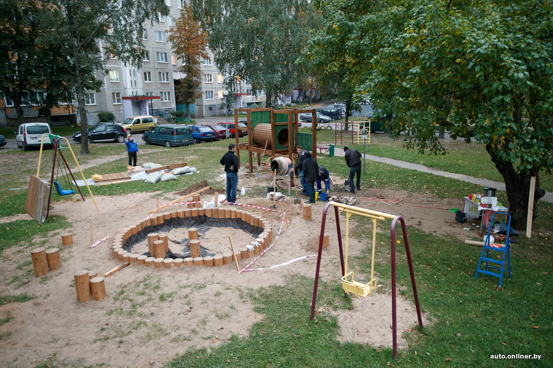 Откликнулись буквально несколько человек. Над возведением детского городка, например, работали семь мужчин. Двое — профессионалы, сотрудники строительной фирмы (компании-спонсора), остальные — обычные жители микрорайона Серебрянка.