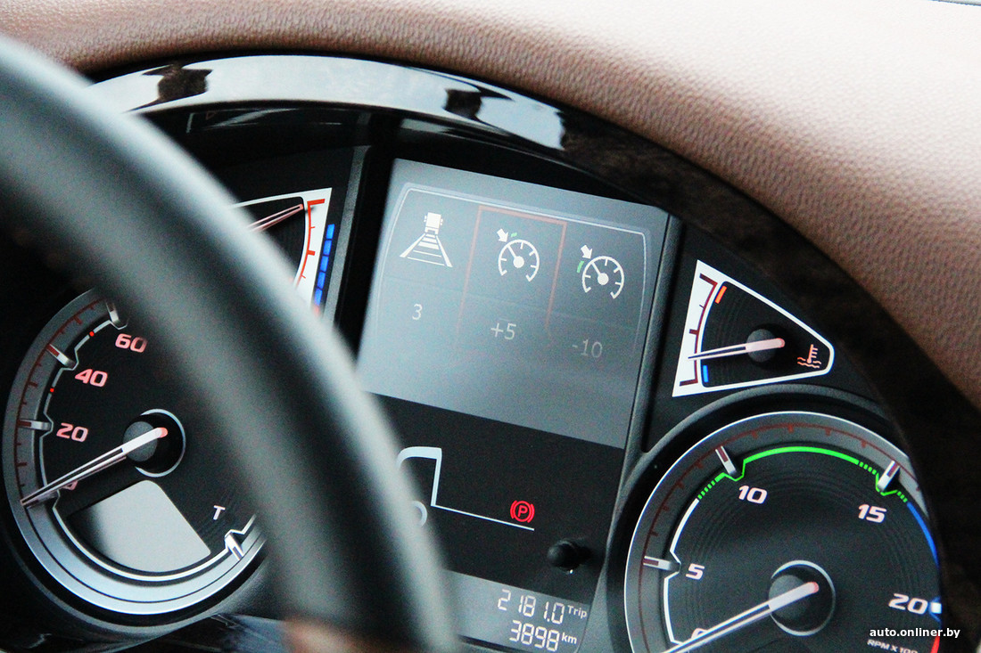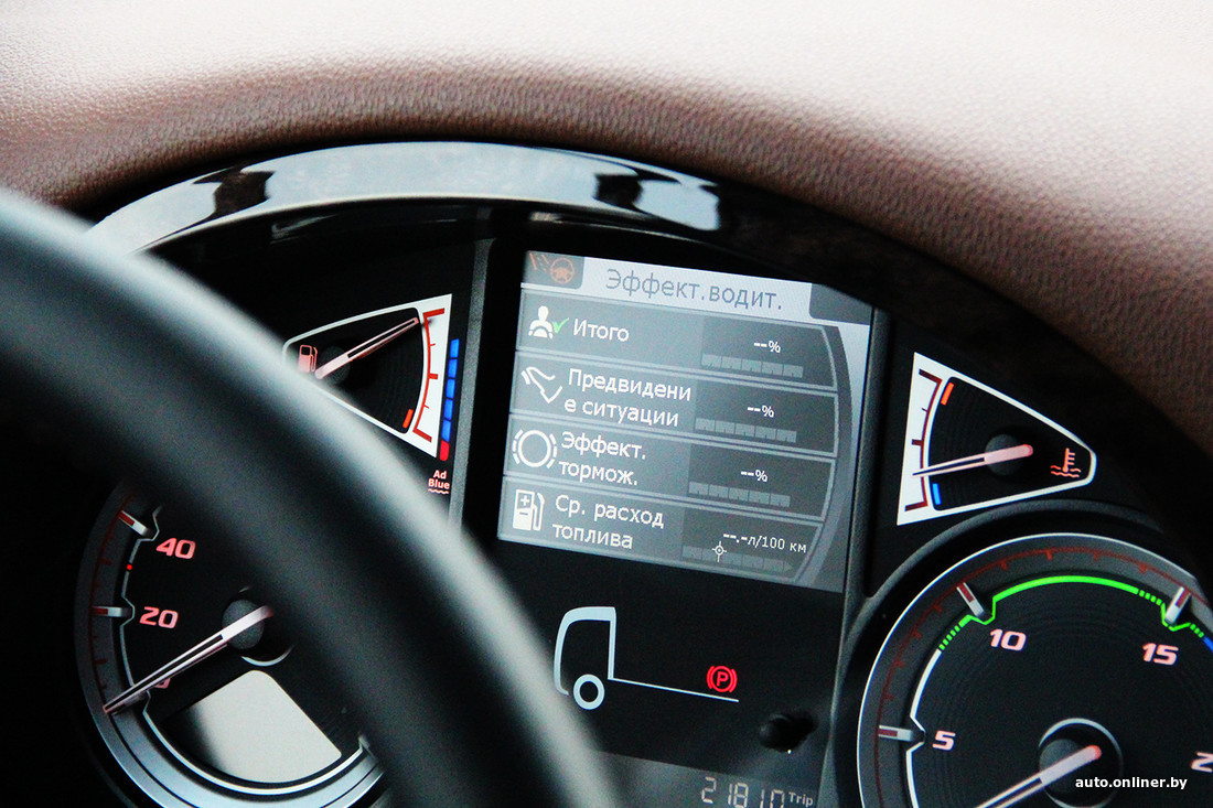 Многотонные грузовики просто обязаны иметь эффективную тормозную систему. При этом чем реже водитель касается педали тормоза — тем лучше. Электроника автомобиля постоянно показывает водителю его эффективность и выставляет баллы за «экономичную» езду. Так, машина подскажет, когда лучше использовать ретардер вместо рабочих тормозов. Это система замедления автомобиля двигателем, которая особенно актуальна в горной местности, где штатная тормозная система может и не выдержать нагрузки. Наловчившись пользоваться этой штукой, можно проехать весь город практически не трогая левой педали.