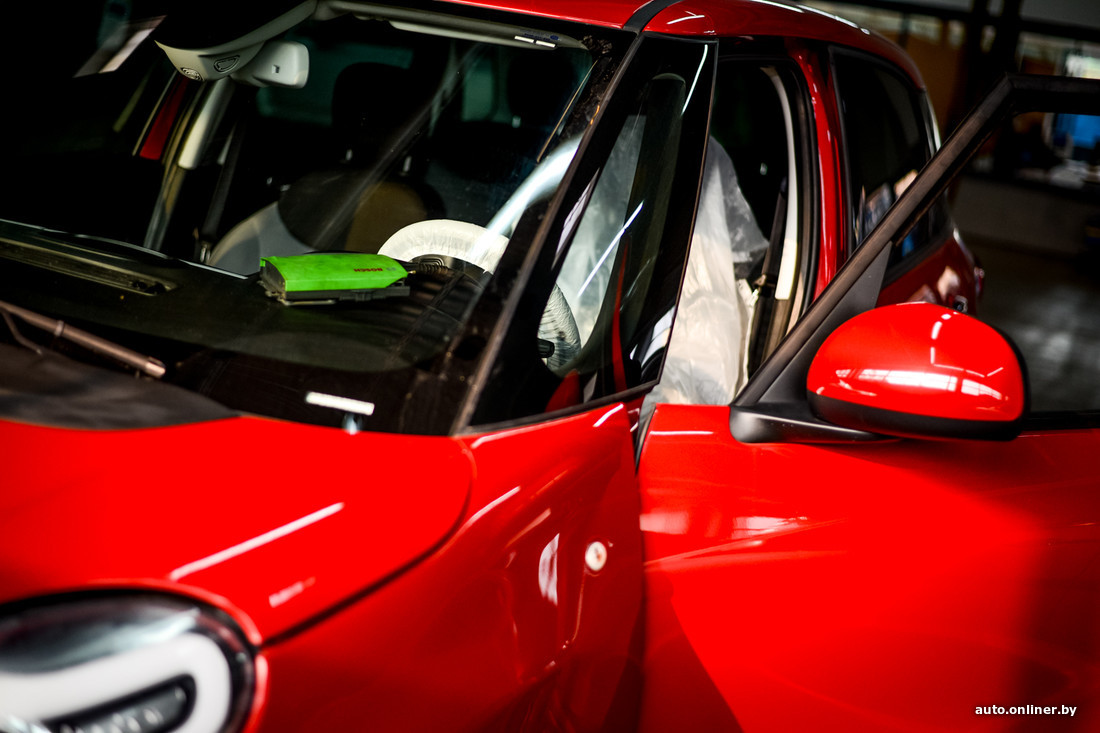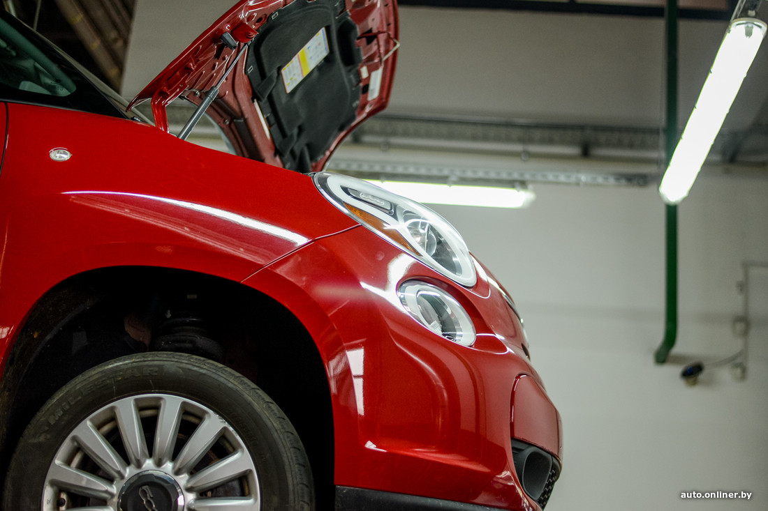 На станции заметили, что эта модель, скорее всего, станет популярной и в нашей стране, но лишь спустя некоторое время. Пока же 500L только начинают появляться в Беларуси. В данном конкретном автомобиле посоветовали заменить задние тормозные диски с колодками, щетки стеклоочистителя. Обнаружили две потертости на заднем бампере, вмятины на передней пластиковой «юбке» с обеих сторон, течь маслозаливной горловины, неравномерный износ протектора шин. Компьютерная диагностика не выявила актуальных ошибок. Единственная ошибка, оставшаяся в истории, — «напряжение ниже порогового значения» — появилась, скорее всего, из-за разряженного аккумулятора.
