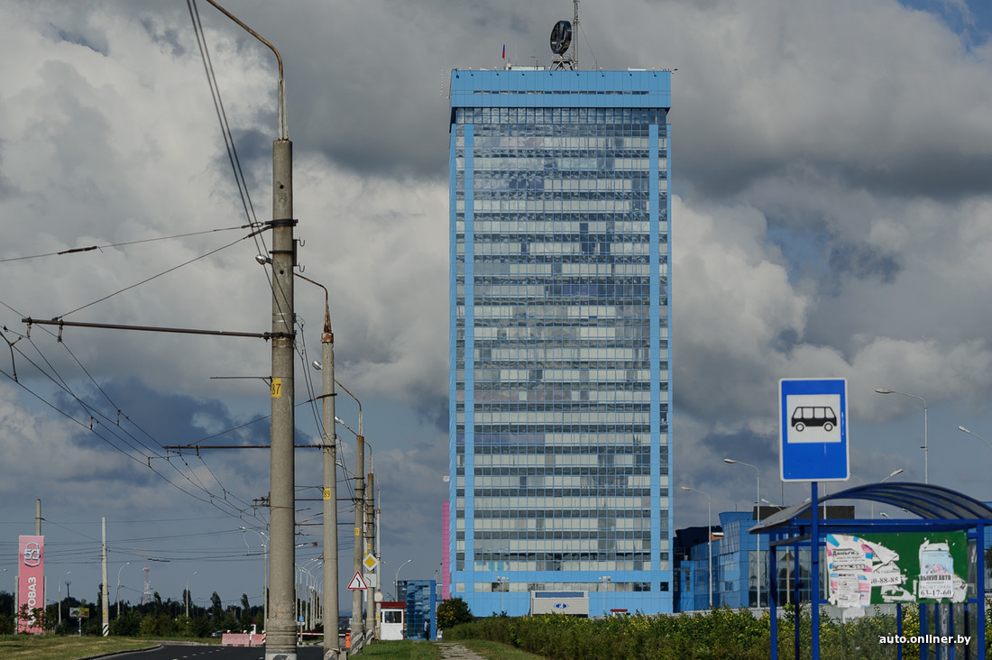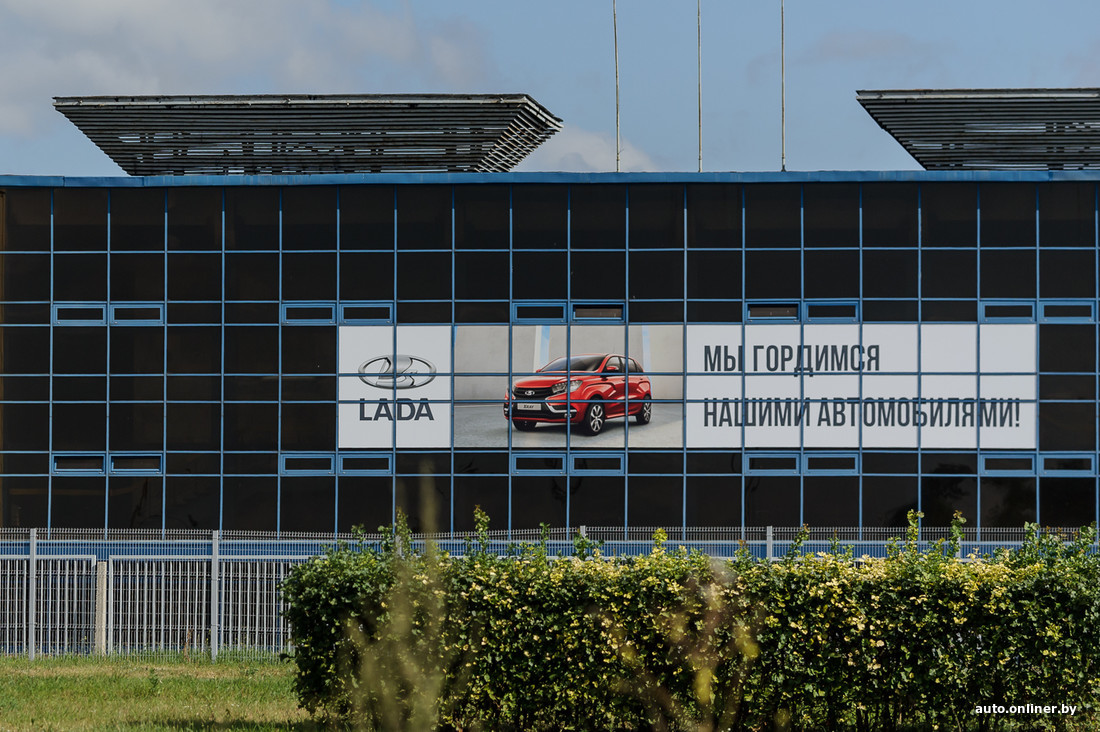 Из какой точки ни глянь, взгляд цепляется за узнаваемую высотку главного здания Lada. Рядом с территорией завода — мотивирующие баннеры и растяжки, что не мешает тут же проводить радарный контроль скорости.