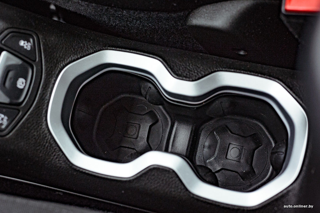В салоне исторические артефакты встречаются еще чаще. На колонках в дверях красуются две круглые «фары» и 7-зубая улыбка Jeep. Этот же рисунок есть в багажнике и у основания салонного зеркала заднего вида. Надпись Since 1941 на центральной консоли не позволит владельцу забыть год основания компании Jeep. Кресты, напоминающие канистры, можно найти еще и на дне подстаканников. Объединенный с воздуховодом поручень над бардачком должен вызвать в памяти силуэт саперной лопатки (как на военных «Джипах»). Самые внимательные еще заметят крохотный силуэт Jeep на лобовом стекле справа. Иной раз, натыкаясь на очередную подобную находку, задумываешься, а не переборщили ли американцы?