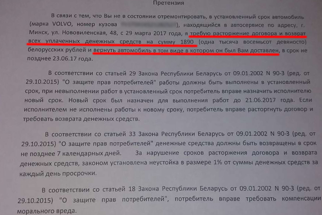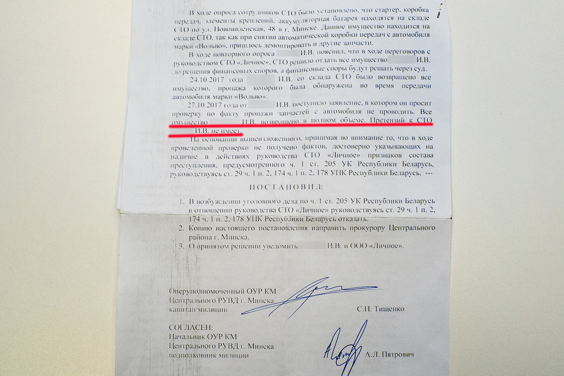 Семья не один месяц борется со станцией техобслуживания ООО «Личное» на ул. Нововиленской в Минске: вначале за ремонт машины, потом за возврат переданных денег. В результате конфликта клиенты дошли до милиции, а потом и до суда, еще позже — до отдела принудительного исполнения. «Проблема же в затянувшемся ремонте АКПП и бесконечных обещаниях в стиле „скоро все сделаем“, — говорит Иван. — Мы выиграли суд, но конфликт до сих пор не исчерпан, ведь деньги еще не вернули». В СТО же говорят, что им не передали полную сумму за коробку передач, потому о финале работ не может быть и речи. Также сотрудники предоставили документы, удостоверяющие, что Volvo числился в розыске, что подано заявление об отмене решения суда, и другие.