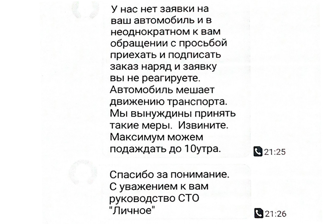 «Андрей, чье имя упоминается в материале, официально не работал в качестве директора на станции в момент, когда ему передавал деньги клиент Иван. Их взаимоотношения, передача денег и обещания не касаются нашей компании после сентября. Директором являлся Юрий Степанович. После октября Андрей находится в заключении. О требовании убрать автомобиль клиент был также уведомлен».